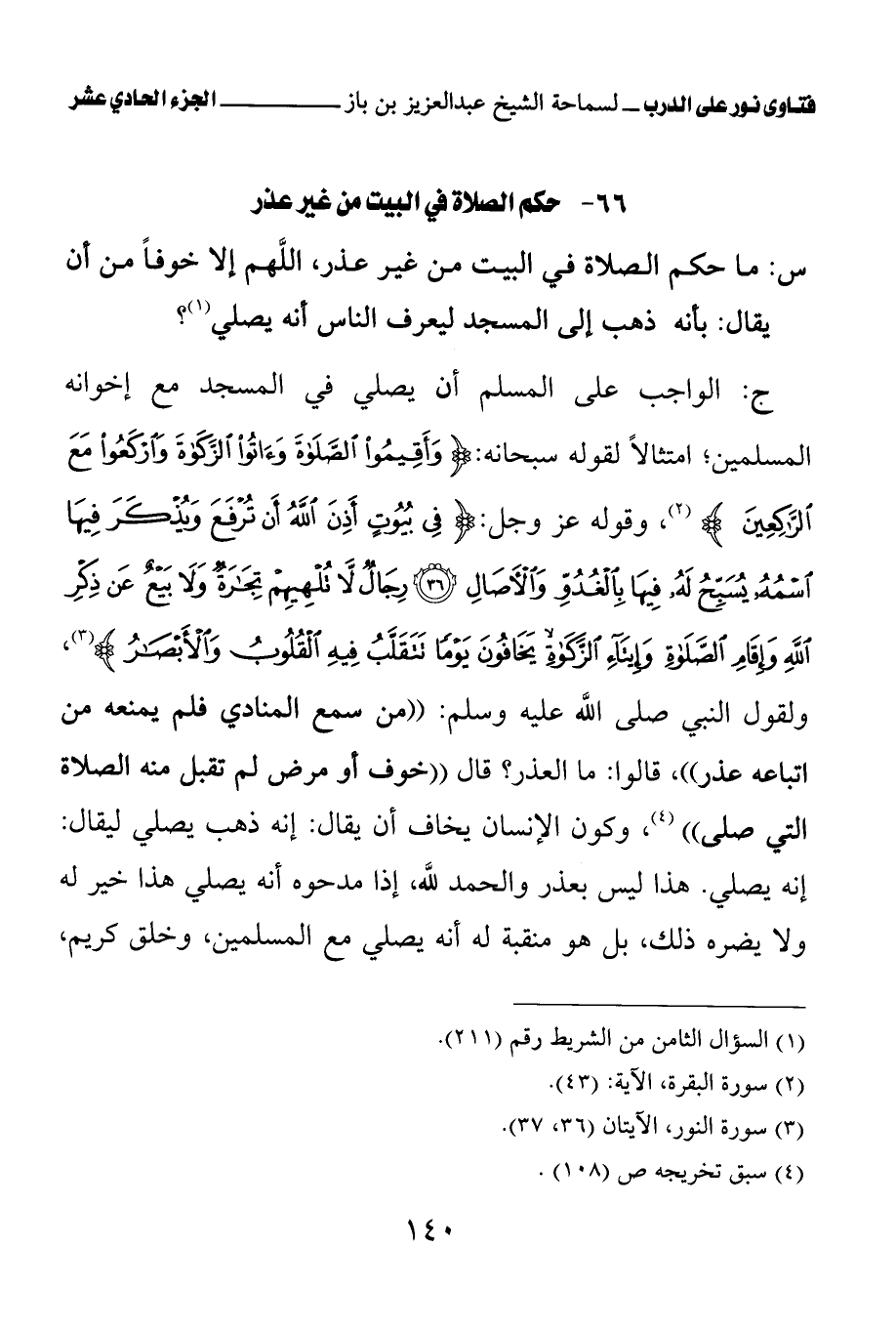 ج: الواجب على المسلم أن يصلي في المسجد مع إخوانه المسلمين؛ امتثالا لقوله سبحانه: {وَأَقِيمُوا الصَّلَاةَ وَآتُوا الزَّكَاةَ وَارْكَعُوا مَعَ الرَّاكِعِينَ} (¬2)، وقوله عز وجل: {فِي بُيُوتٍ أَذِنَ اللَّهُ أَنْ تُرْفَعَ وَيُذْكَرَ فِيهَا اسْمُهُ يُسَبِّحُ لَهُ فِيهَا بِالْغُدُوِّ وَالْآصَالِ} (¬3) {رِجَالٌ لَا تُلْهِيهِمْ تِجَارَةٌ وَلَا بَيْعٌ عَنْ ذِكْرِ اللَّهِ وَإِقَامِ الصَّلَاةِ وَإِيتَاءِ الزَّكَاةِ يَخَافُونَ يَوْمًا تَتَقَلَّبُ فِيهِ الْقُلُوبُ وَالْأَبْصَارُ} (¬4)، ولقول النبي صلى الله عليه وسلم: «من سمع المنادي فلم يمنعه من اتباعه عذر»، قالوا: ما العذر؟ قال «خوف أو مرض لم تقبل منه الصلاة التي صلى (¬5)» وكون الإنسان يخاف أن يقال: إنه ذهب يصلي ليقال: إنه يصلي. هذا ليس بعذر والحمد لله، إذا مدحوه أنه يصلي هذا خير له ولا يضره ذلك، بل هو منقبة له أنه يصلي مع المسلمين، وخلق كريم،