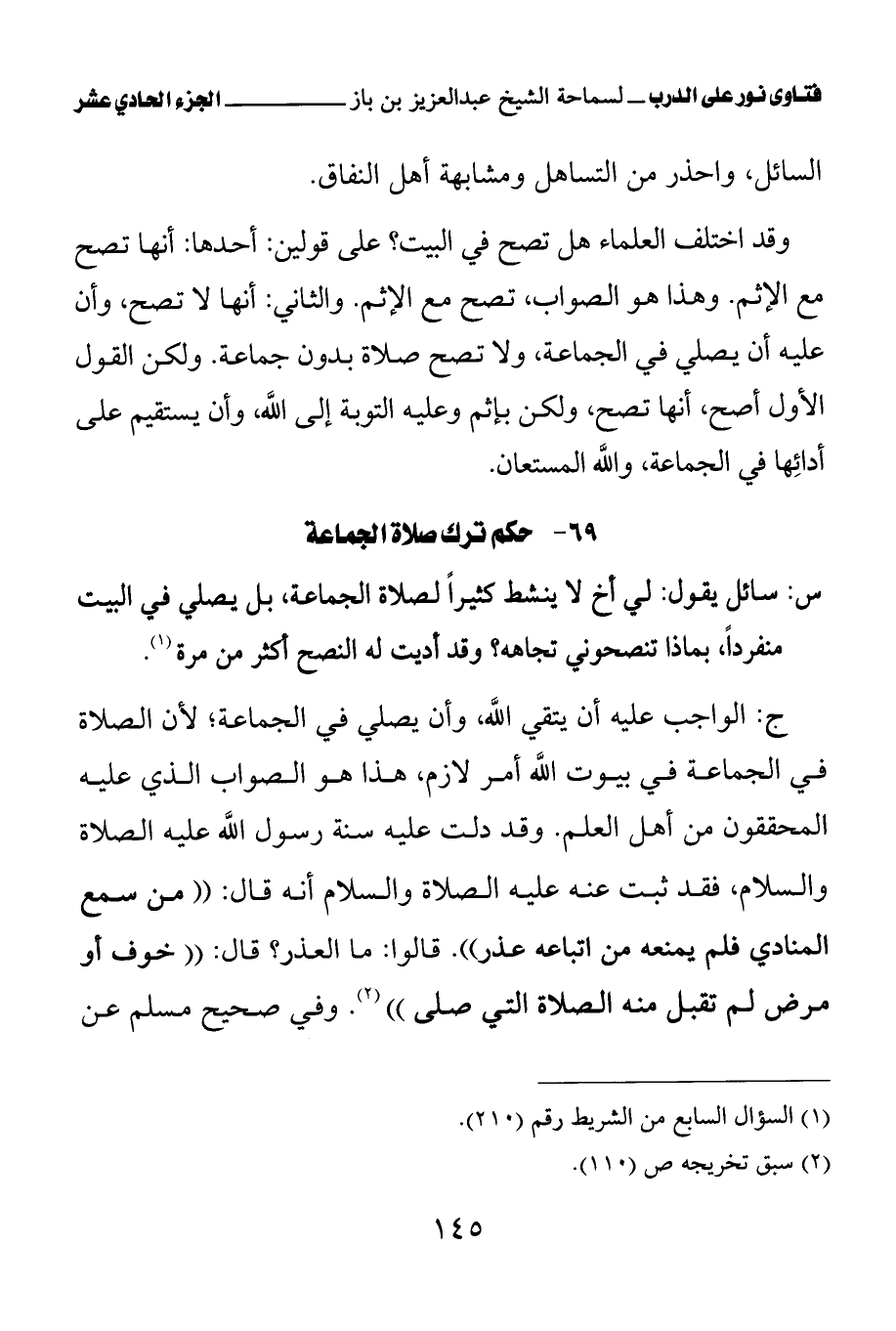ج: الواجب عليه أن يتقي الله، وأن يصلي في الجماعة؛ لأن الصلاة في الجماعة في بيوت الله أمر لازم، هذا هو الصواب الذي عليه المحققون من أهل العلم. وقد دلت عليه سنة رسول الله عليه الصلاة والسلام، فقد ثبت عنه عليه الصلاة والسلام أنه قال: «من سمع المنادي فلم يمنعه من اتباعه عذر». قالوا: ما العذر؟ قال: «خوف أو مرض لم تقبل منه الصلاة التي صلى (¬2)» وفي صحيح مسلم عن