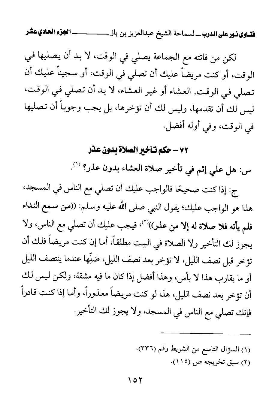 س: هل علي إثم في تأخير صلاة العشاء بدون عذر؟ (¬1)
