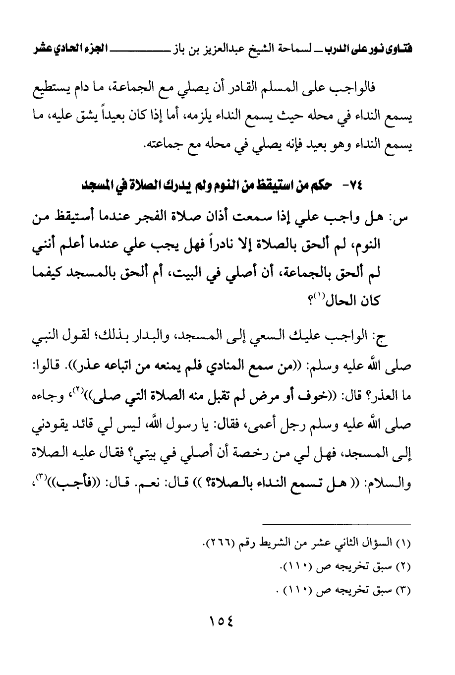 74 - حكم من استيقظ من النوم ولم يدرك الصلاة في المسجد