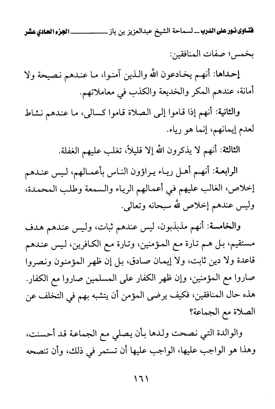 والخامسة: أنهم مذبذبون، ليس عندهم ثبات، وليس عندهم هدف مستقيم، بل هم تارة مع المؤمنين، وتارة مع الكافرين، ليس عندهم قاعدة ولا دين ثابت، ولا إيمان صادق، بل إن ظهر المؤمنون ونصروا صاروا مع المؤمنين، وإن ظهر الكفار على المسلمين صاروا مع الكفار. هذه حال المنافقين، فكيف يرضى المؤمن أن يتشبه بهم في التخلف عن الصلاة مع الجماعة؟