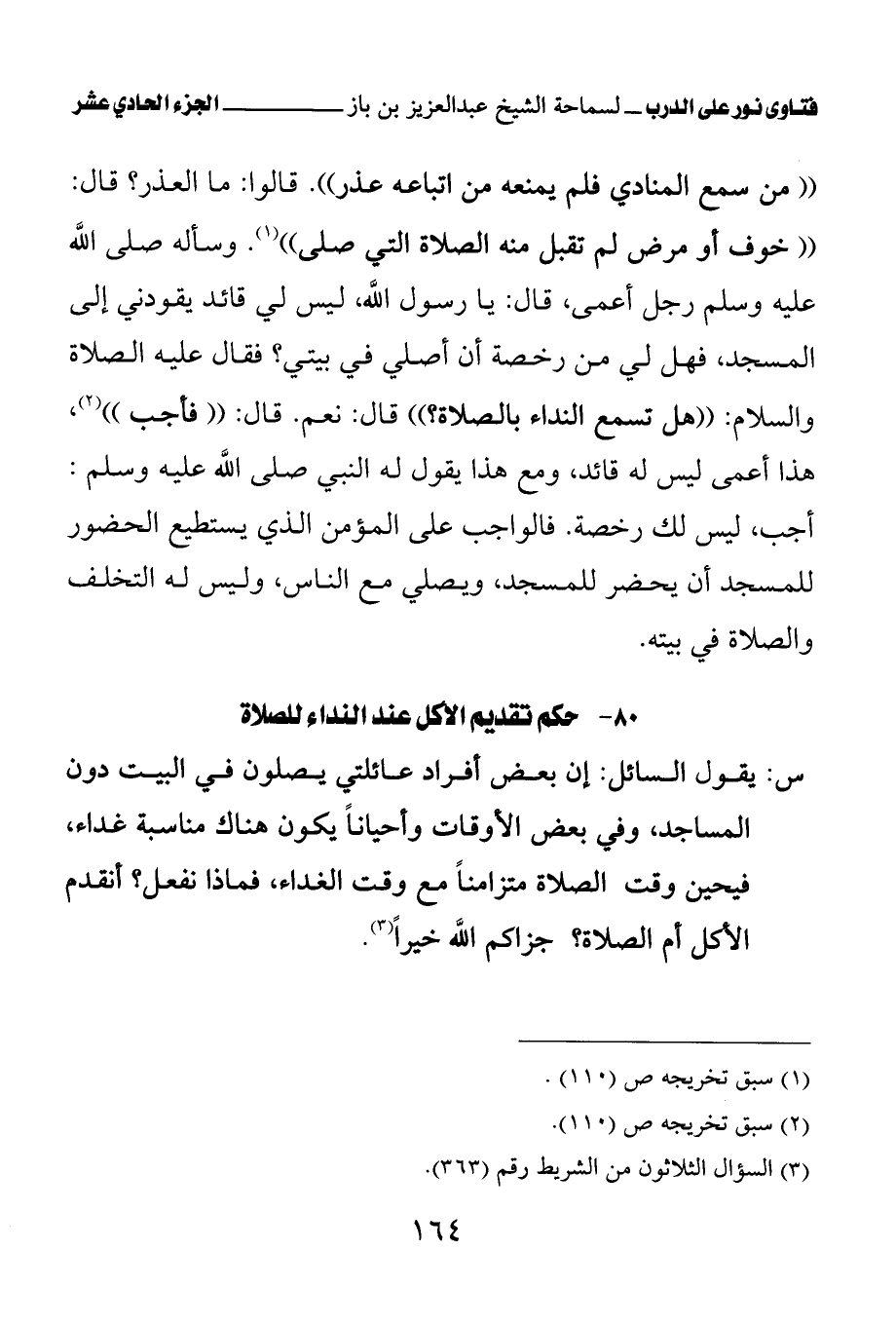 «من سمع المنادي فلم يمنعه من اتباعه عذر». قالوا: ما العذر؟ قال: «خوف أو مرض لم تقبل منه الصلاة التي صلى (¬1)» وسأله صلى الله عليه وسلم رجل أعمى، قال: «يا رسول الله، ليس لي قائد يقودني إلى المسجد، فهل لي من رخصة أن أصلي في بيتي؟ فقال عليه الصلاة والسلام: «هل تسمع النداء بالصلاة؟» قال: نعم. قال: «فأجب» (¬2)» هذا أعمى ليس له قائد، ومع هذا يقول له النبي صلى الله عليه وسلم: أجب، ليس لك رخصة. فالواجب على المؤمن الذي يستطيع الحضور للمسجد أن يحضر للمسجد، ويصلي مع الناس، وليس له التخلف والصلاة في بيته.