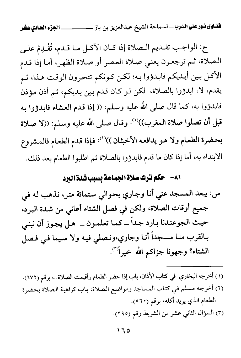 ج: الواجب تقديم الصلاة إذا كان الأكل ما قدم، تقدم على الصلاة، ثم ترجعون يعني صلاة العصر أو صلاة الظهر، أما إذا قدم الأكل بين أيديكم فابدؤوا به؛ لكن كونكم تتحرون الوقت هذا، ثم يقدم، لا، ابدؤوا بالصلاة، لكن لو كان قدم بين يديكم، ثم أذن مؤذن فابدؤوا به، كما قال صلى الله عليه وسلم: «إذا قدم العشاء فابدؤوا به قبل أن تصلوا صلاة المغرب (¬1)» وقال صلى الله عليه وسلم: «لا صلاة بحضرة الطعام ولا هو يدافعه الأخبثان (¬2)» فإذا قدم الطعام فالمشروع الابتداء به، أما إذا كان ما قدم فابدؤوا بالصلاة ثم اطلبوا الطعام بعد ذلك.
