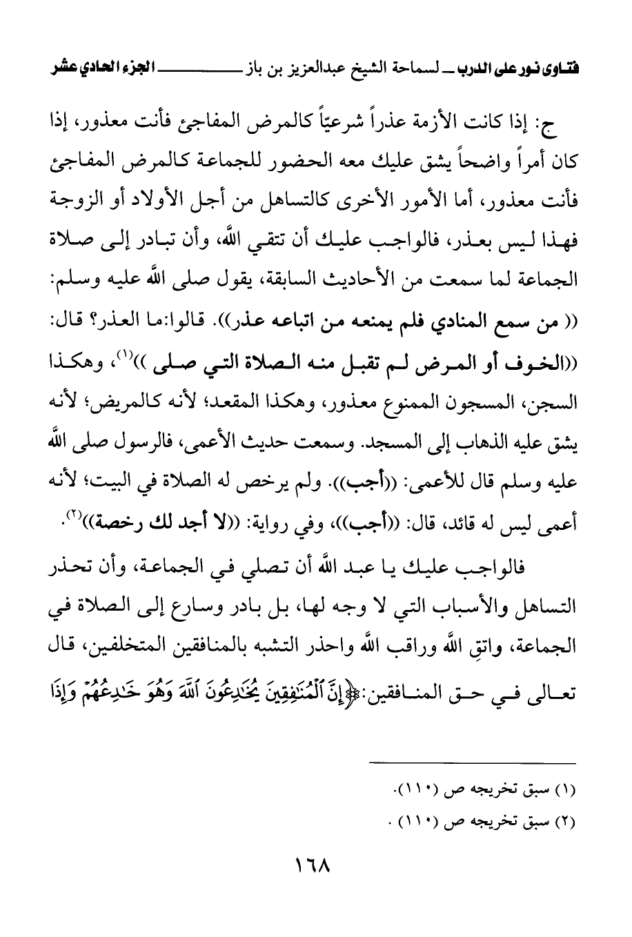 ج: إذا كانت الأزمة عذرا شرعيا كالمرض المفاجئ فأنت معذور، إذا كان أمرا واضحا يشق عليك معه الحضور للجماعة كالمرض المفاجئ فأنت معذور، أما الأمور الأخرى كالتساهل من أجل الأولاد أو الزوجة فهذا ليس بعذر، فالواجب عليك أن تتقي الله، وأن تبادر إلى صلاة الجماعة لما سمعت من الأحاديث السابقة، يقول صلى الله عليه وسلم: «من سمع المنادي فلم يمنعه من اتباعه عذر». قالوا: ما العذر؟ قال: «الخوف أو المرض لم تقبل منه الصلاة التي صلى (¬1)» وهكذا السجن، المسجون الممنوع معذور، وهكذا المقعد؛ لأنه كالمريض؛ لأنه يشق عليه الذهاب إلى المسجد. وسمعت حديث الأعمى، فالرسول صلى الله عليه وسلم قال للأعمى: «أجب». ولم يرخص له الصلاة في البيت؛ لأنه أعمى ليس له قائد، قال: «أجب»، وفي رواية: «لا أجد لك رخصة (¬2)»
