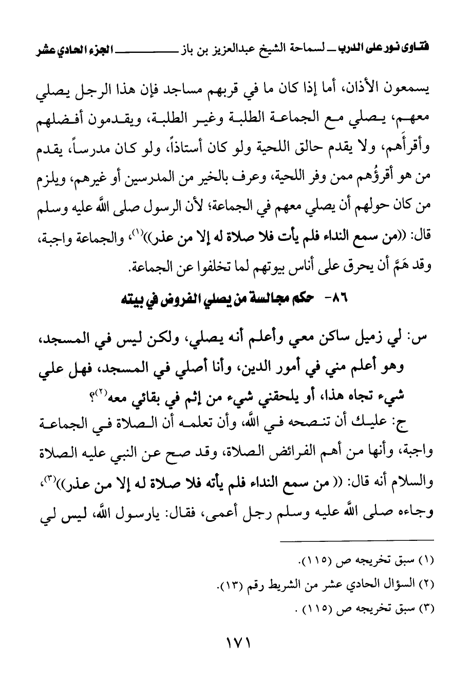 ج: عليك أن تنصحه في الله، وأن تعلمه أن الصلاة في الجماعة واجبة، وأنها من أهم الفرائض الصلاة، وقد صح عن النبي عليه الصلاة والسلام أنه قال: «من سمع النداء فلم يأته فلا صلاة له إلا من عذر (¬2)» وجاءه صلى الله عليه وسلم رجل أعمى، فقال: «يا رسول الله، ليس لي