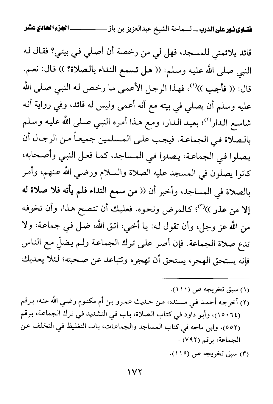 (¬1) أخرجه مسلم في كتاب المساجد ومواضع الصلاة، باب يجب إتيان المسجد على من سمع النداء برقم (653).