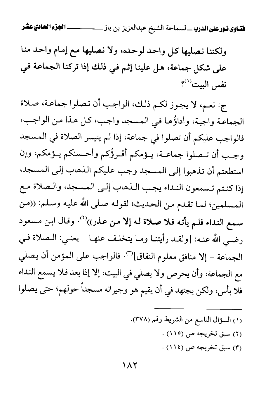 ج: نعم، لا يجوز لكم ذلك، الواجب أن تصلوا جماعة، صلاة الجماعة واجبة، وأداؤها في المسجد واجب، كل هذا من الواجب، فالواجب عليكم أن تصلوا في جماعة، إذا لم يتيسر الصلاة في المسجد وجب أن تصلوا جماعة، يؤمكم أقرؤكم وأحسنكم يؤمكم، وإن استطعتم أن تذهبوا إلى المسجد وجب عليكم الذهاب إلى المسجد، إذا كنتم تسمعون النداء يجب الذهاب إلى المسجد، والصلاة مع المسلمين؛ لما تقدم من الحديث؛ لقوله صلى الله عليه وسلم: «من سمع النداء فلم يأته فلا صلاة له إلا من عذر (¬2)» وقال ابن مسعود رضي الله عنه: «ولقد رأيتنا وما يتخلف عنها - يعني: الصلاة في الجماعة - إلا منافق معلوم النفاق (¬3)» فالواجب على المؤمن أن يصلي مع الجماعة، وأن يحرص ولا يصلي في البيت، إلا إذا بعد فلا يسمع النداء فلا بأس، ولكن يجتهد في أن يقيم هو وجيرانه مسجدا حولهم؛ حتى يصلوا