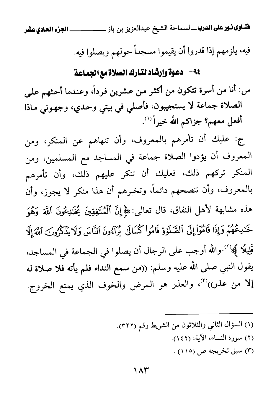 ج: عليك أن تأمرهم بالمعروف، وأن تنهاهم عن المنكر، ومن المعروف أن يؤدوا الصلاة جماعة في المساجد مع المسلمين، ومن المنكر تركهم ذلك، فعليك أن تنكر عليهم ذلك، وأن تأمرهم بالمعروف، وأن تنصحهم دائما، وتخبرهم أن هذا منكر لا يجوز، وأن هذه مشابهة لأهل النفاق، قال تعالى: {إِنَّ الْمُنَافِقِينَ يُخَادِعُونَ اللَّهَ وَهُوَ خَادِعُهُمْ وَإِذَا قَامُوا إِلَى الصَّلَاةِ قَامُوا كُسَالَى يُرَاءُونَ النَّاسَ وَلَا يَذْكُرُونَ اللَّهَ إِلَّا قَلِيلًا} (¬2). والله أوجب على الرجال أن يصلوا في الجماعة في المساجد، يقول النبي صلى الله عليه وسلم: «من سمع النداء فلم يأته فلا صلاة له إلا من عذر (¬3)» والعذر هو المرض والخوف الذي يمنع الخروج.