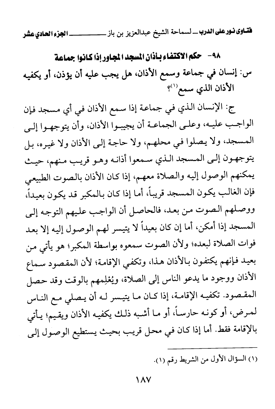 98 - حكم الاكتفاء بأذان المسجد المجاور إذا كانوا جماعة