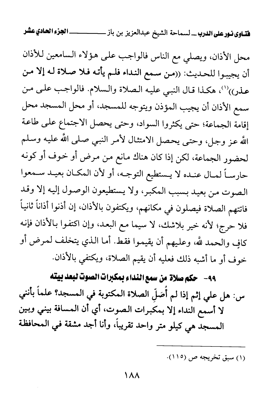 99 - حكم صلاة من سمع النداء بمكبرات الصوت لبعد بيته