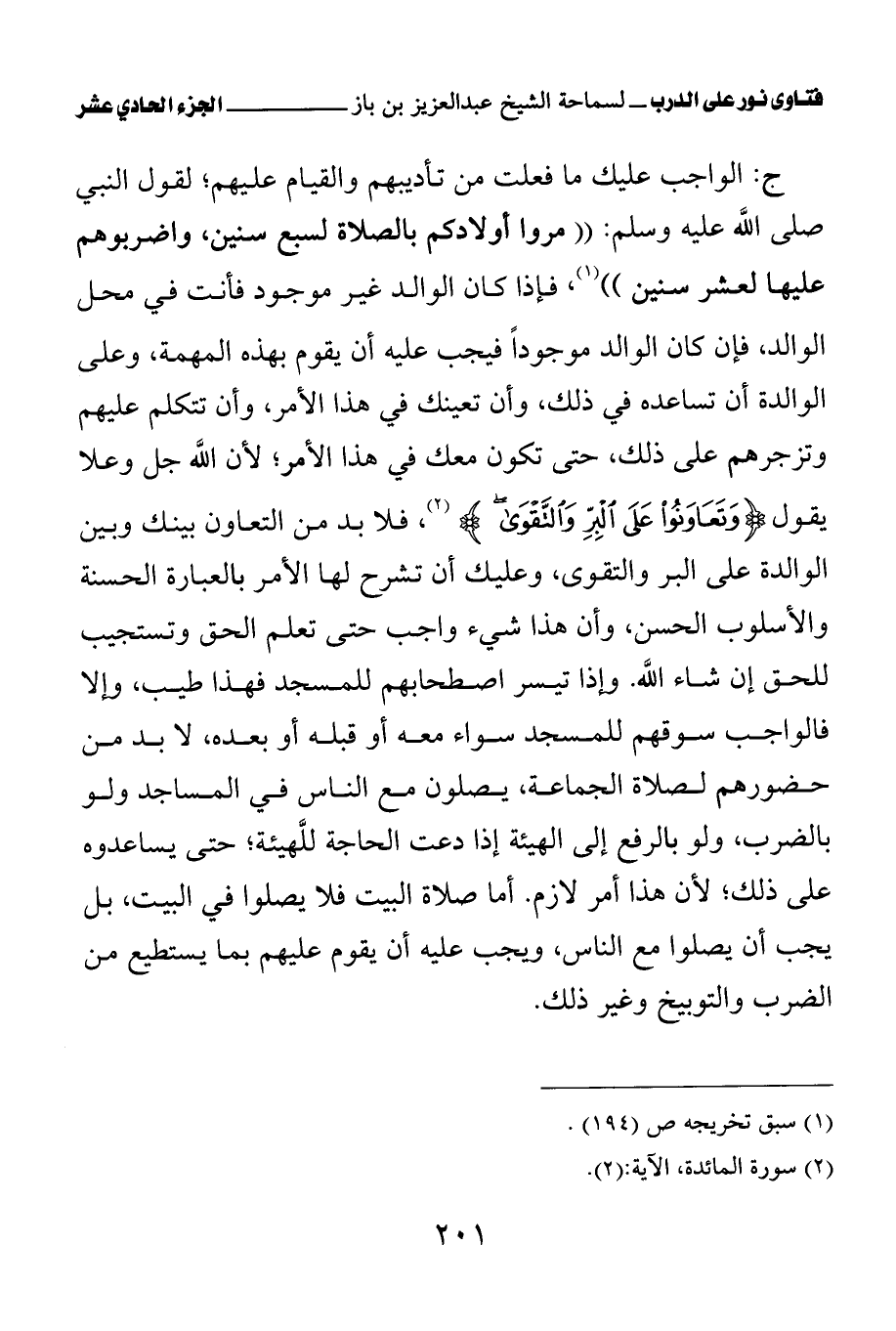 ج: الواجب عليك ما فعلت من تأديبهم والقيام عليهم؛ لقول النبي صلى الله عليه وسلم: «مروا أولادكم بالصلاة لسبع سنين، واضربوهم عليها لعشر سنين (¬1)» فإذا كان الوالد غير موجود فأنت في محل الوالد، فإن كان الوالد موجودا فيجب عليه أن يقوم بهذه المهمة، وعلى الوالدة أن تساعده في ذلك، وأن تعينك في هذا الأمر، وأن تتكلم عليهم وتزجرهم على ذلك، حتى تكون معك في هذا الأمر؛ لأن الله جل وعلا يقول: {وَتَعَاوَنُوا عَلَى الْبِرِّ وَالتَّقْوَى} (¬2)، فلا بد من التعاون بينك وبين الوالدة على البر والتقوى، وعليك أن تشرح لها الأمر بالعبارة الحسنة والأسلوب الحسن، وأن هذا شيء واجب حتى تعلم الحق وتستجيب للحق إن شاء الله. وإذا تيسر اصطحابهم للمسجد فهذا طيب، وإلا فالواجب سوقهم للمسجد سواء معه أو قبله أو بعده، لا بد من حضورهم لصلاة الجماعة، يصلون مع الناس في المساجد ولو بالضرب، ولو بالرفع إلى الهيئة إذا دعت الحاجة للهيئة؛ حتى يساعدوه على ذلك؛ لأن هذا أمر لازم. أما صلاة البيت فلا يصلوا في البيت، بل يجب أن يصلوا مع الناس، ويجب عليه أن يقوم عليهم بما يستطيع من الضرب والتوبيخ وغير ذلك.