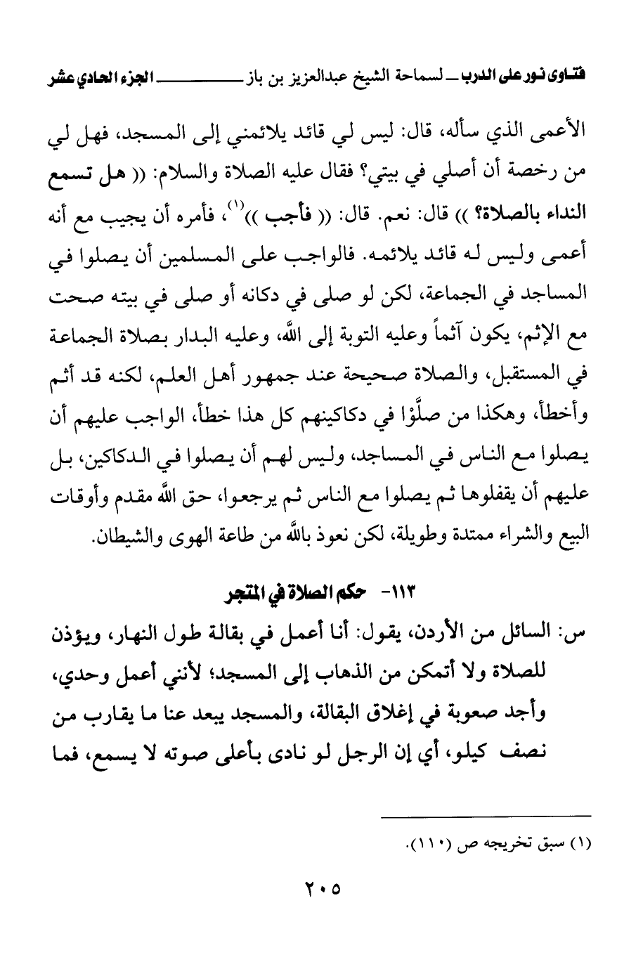 الأعمى الذي سأله، قال: «ليس لي قائد يلائمني إلى المسجد، فهل لي من رخصة أن أصلي في بيتي؟ فقال عليه الصلاة والسلام: " هل تسمع النداء بالصلاة؟ " قال: نعم. قال: " فأجب (¬1)» فأمره أن يجيب مع أنه أعمى وليس له قائد يلائمه. فالواجب على المسلمين أن يصلوا في المساجد في الجماعة، لكن لو صلى في دكانه أو صلى في بيته صحت مع الإثم، يكون آثما وعليه التوبة إلى الله، وعليه البدار بصلاة الجماعة في المستقبل، والصلاة صحيحة عند جمهور أهل العلم، لكنه قد أثم وأخطأ، وهكذا من صلوا في دكاكينهم كل هذا خطأ، الواجب عليهم أن يصلوا مع الناس في المساجد، وليس لهم أن يصلوا في الدكاكين، بل عليهم أن يقفلوها ثم يصلوا مع الناس ثم يرجعوا، حق الله مقدم وأوقات البيع والشراء ممتدة وطويلة، لكن نعوذ بالله من طاعة الهوى والشيطان.