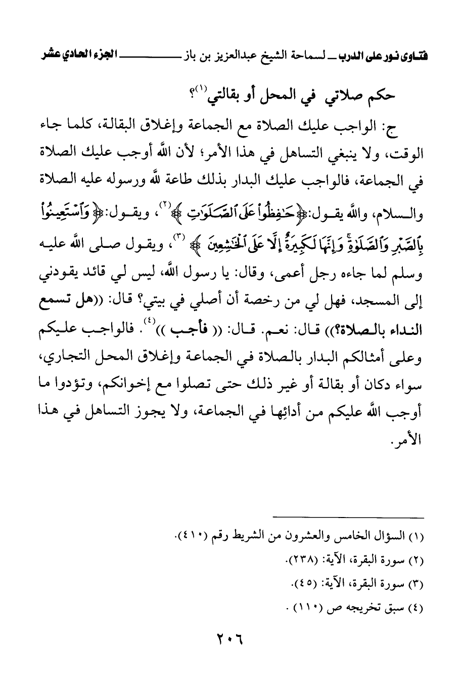 ج: الواجب عليك الصلاة مع الجماعة وإغلاق البقالة، كلما جاء الوقت، ولا ينبغي التساهل في هذا الأمر؛ لأن الله أوجب عليك الصلاة في الجماعة، فالواجب عليك البدار بذلك طاعة لله ورسوله عليه الصلاة والسلام، والله يقول: {حَافِظُوا عَلَى الصَّلَوَاتِ} (¬2)، ويقول: {وَاسْتَعِينُوا بِالصَّبْرِ وَالصَّلَاةِ وَإِنَّهَا لَكَبِيرَةٌ إِلَّا عَلَى الْخَاشِعِينَ} (¬3)، ويقول صلى الله عليه وسلم لما جاءه رجل أعمى، وقال: «يا رسول الله، ليس لي قائد يقودني إلى المسجد، فهل لي من رخصة أن أصلي في بيتي؟ قال: " هل تسمع النداء بالصلاة؟ " قال: نعم. قال: " فأجب (¬4)» فالواجب عليكم وعلى أمثالكم البدار بالصلاة في الجماعة وإغلاق المحل التجاري، سواء دكان أو بقالة أو غير ذلك حتى تصلوا مع إخوانكم، وتؤدوا ما أوجب الله عليكم من أدائها في الجماعة، ولا يجوز التساهل في هذا الأمر.