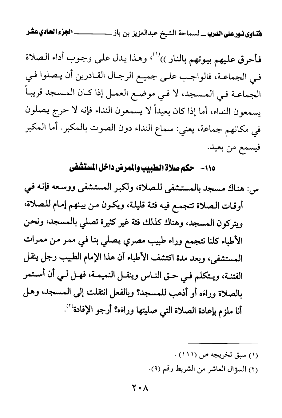 فأحرق عليهم بيوتهم بالنار (¬1)» وهذا يدل على وجوب أداء الصلاة في الجماعة، فالواجب على جميع الرجال القادرين أن يصلوا في الجماعة في المسجد، لا في موضع العمل إذا كان المسجد قريبا يسمعون النداء، أما إذا كان بعيدا لا يسمعون النداء فإنه لا حرج يصلون في مكانهم جماعة، يعني: سماع النداء دون الصوت بالمكبر. أما المكبر فيسمع من بعيد.