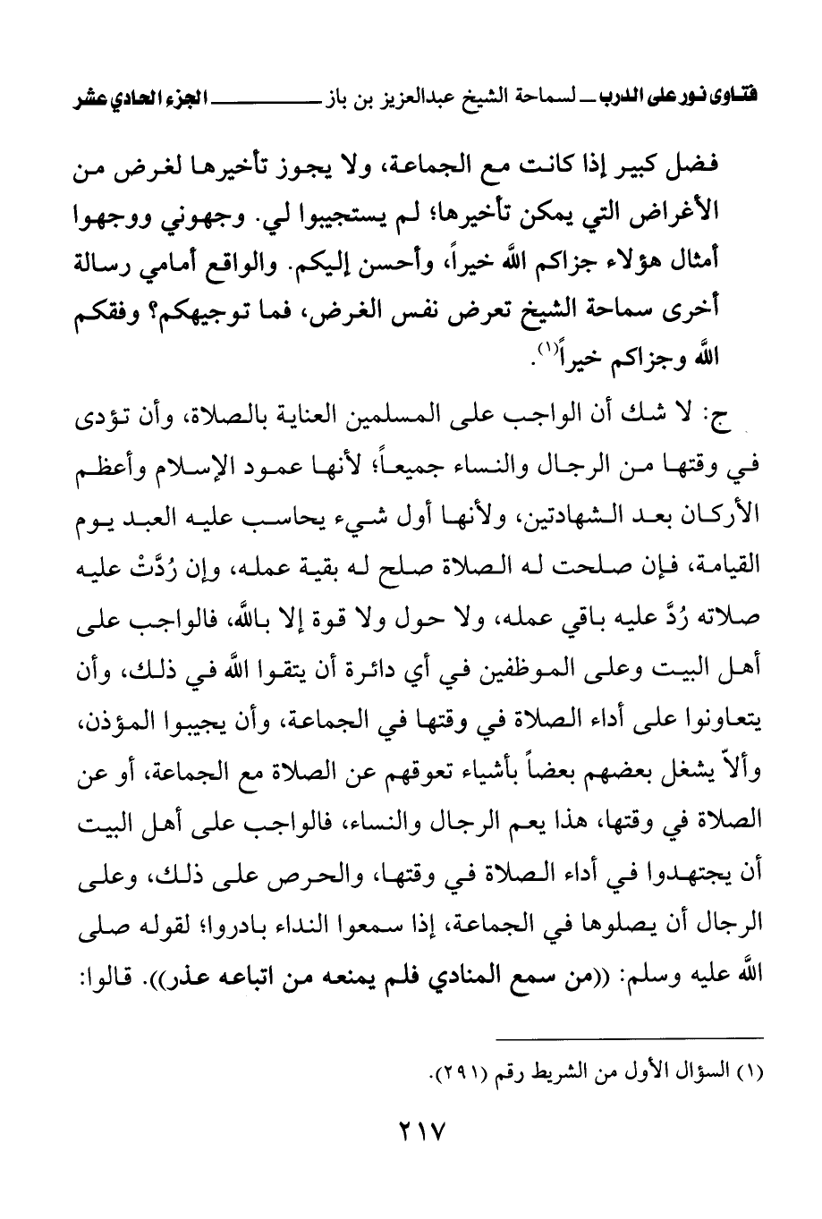 فضل كبير إذا كانت مع الجماعة، ولا يجوز تأخيرها لغرض من الأغراض التي يمكن تأخيرها؛ لم يستجيبوا لي. وجهوني ووجهوا أمثال هؤلاء جزاكم الله خيرا، وأحسن إليكم. والواقع أمامي رسالة أخرى سماحة الشيخ تعرض نفس الغرض، فما توجيهكم؟ وفقكم الله وجزاكم خيرا (¬1)