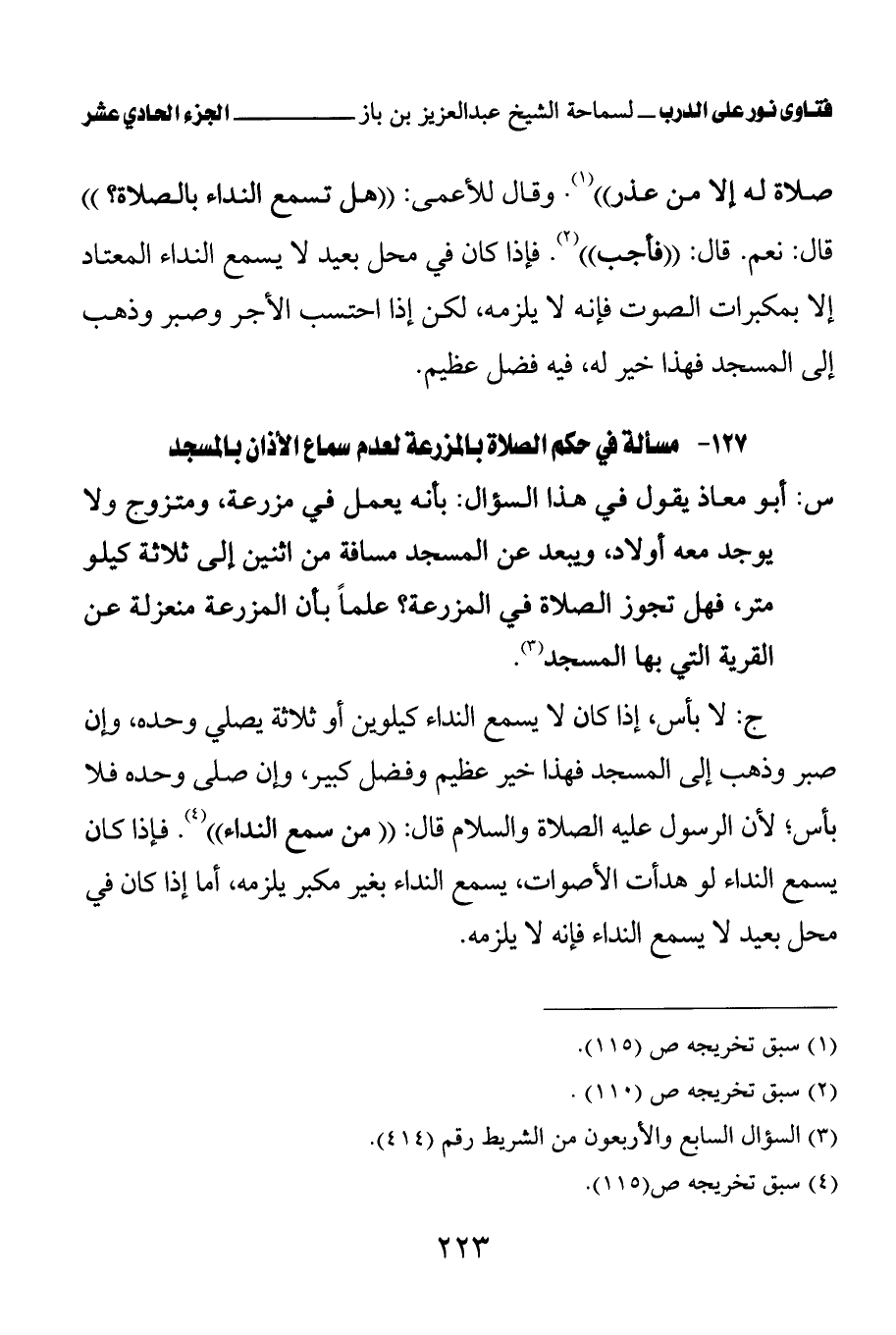 127 - مسألة في حكم الصلاة بالمزرعة لعدم سماع الأذان بالمسجد