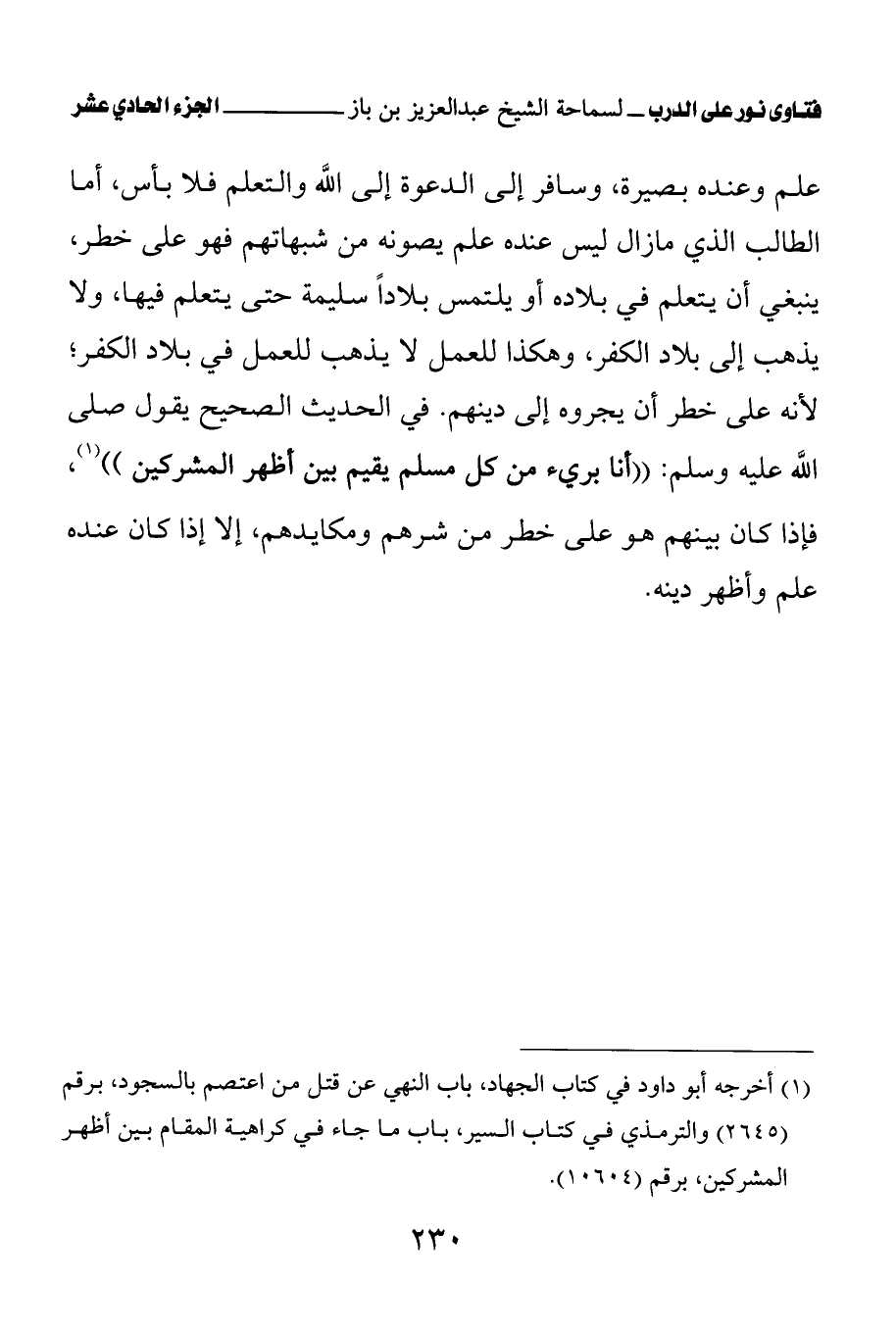 علم وعنده بصيرة، وسافر إلى الدعوة إلى الله والتعلم فلا بأس، أما الطالب الذي مازال ليس عنده علم يصونه من شبهاتهم فهو على خطر، ينبغي أن يتعلم في بلاده أو يلتمس بلادا سليمة حتى يتعلم فيها، ولا يذهب إلى بلاد الكفر، وهكذا للعمل لا يذهب للعمل في بلاد الكفر؛ لأنه على خطر أن يجروه إلى دينهم. في الحديث الصحيح يقول صلى الله عليه وسلم: «أنا بريء من كل مسلم يقيم بين أظهر المشركين (¬1)» فإذا كان بينهم هو على خطر من شرهم ومكايدهم، إلا إذا كان عنده علم وأظهر دينه.