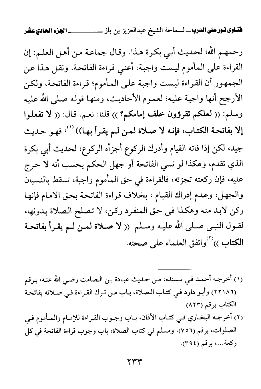 رحمهم الله؛ لحديث أبي بكرة هذا. وقال جماعة من أهل العلم: إن القراءة على المأموم ليست واجبة، أعني قراءة الفاتحة. ونقل هذا عن الجمهور أن القراءة ليست واجبة على المأموم؛ قراءة الفاتحة، ولكن الأرجح أنها واجبة عليه؛ لعموم الأحاديث، ومنها قوله صلى الله عليه وسلم: «لعلكم تقرؤون خلف إمامكم؟ " قلنا: نعم. قال: " لا تفعلوا إلا بفاتحة الكتاب، فإنه لا صلاة لمن لم يقرأ بها (¬1)» فهو حديث جيد، لكن إذا فاته القيام وأدرك الركوع أجزأه الركوع؛ لحديث أبي بكرة الذي تقدم، وهكذا لو نسي الفاتحة أو جهل الحكم يحسب أنه لا حرج عليه، فإن ركعته تجزئه، فالقراءة في حق المأموم واجبة، تسقط بالنسيان والجهل، وعدم إدراك القيام، بخلاف قراءة الفاتحة بحق الإمام فإنها ركن لا بد منه وهكذا في حق المنفرد ركن، لا تصلح الصلاة بدونها، لقول النبي صلى الله عليه وسلم «لا صلاة لمن لم يقرأ بفاتحة الكتاب (¬2)» واتفق العلماء على صحته.