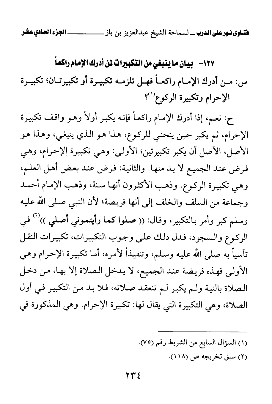 ج: نعم، إذا أدرك الإمام راكعا فإنه يكبر أولا وهو واقف تكبيرة الإحرام، ثم يكبر حين ينحني للركوع، هذا هو الذي ينبغي، وهذا هو الأصل، الأصل أن يكبر تكبيرتين؛ الأولى: وهي تكبيرة الإحرام، وهي فرض عند الجميع لا بد منها. والثانية: فرض عند بعض أهل العلم، وهي تكبيرة الركوع. وذهب الأكثرون أنها سنة، وذهب الإمام أحمد وجماعة من السلف والخلف إلى أنها فريضة؛ لأن النبي صلى الله عليه وسلم كبر وأمر بالتكبير، وقال: «صلوا كما رأيتموني أصلي (¬2)» في الركوع والسجود، فدل ذلك على وجوب التكبيرات، تكبيرات النقل تأسيا به صلى الله عليه وسلم، وتنفيذا لأمره، أما تكبيرة الإحرام وهي الأولى فهذه فريضة عند الجميع، لا يدخل الصلاة إلا بها، من دخل الصلاة بالنية ولم يكبر لم تنعقد صلاته، فلا بد من التكبير في أول الصلاة، وهي التكبيرة التي يقال لها: تكبيرة الإحرام. وهي المذكورة في