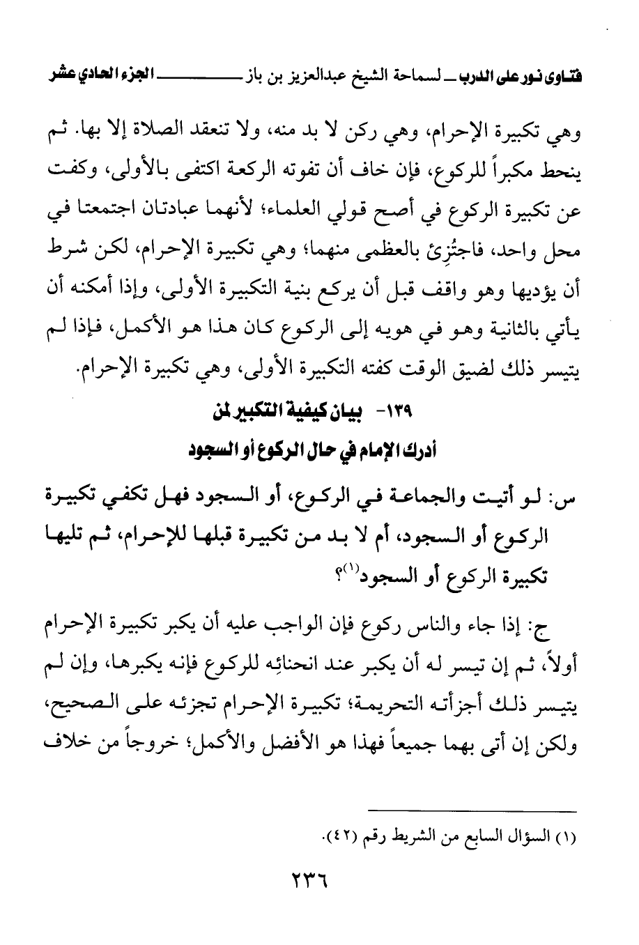 وهي تكبيرة الإحرام، وهي ركن لا بد منه، ولا تنعقد الصلاة إلا بها. ثم ينحط مكبرا للركوع، فإن خاف أن تفوته الركعة اكتفى بالأولى، وكفت عن تكبيرة الركوع في أصح قولي العلماء؛ لأنهما عبادتان اجتمعتا في محل واحد، فاجتزئ بالعظمى منهما؛ وهي تكبيرة الإحرام، لكن شرط أن يؤديها وهو واقف قبل أن يركع بنية التكبيرة الأولى، وإذا أمكنه أن يأتي بالثانية وهو في هويه إلى الركوع كان هذا هو الأكمل، فإذا لم يتيسر ذلك لضيق الوقت كفته التكبيرة الأولى، وهي تكبيرة الإحرام.