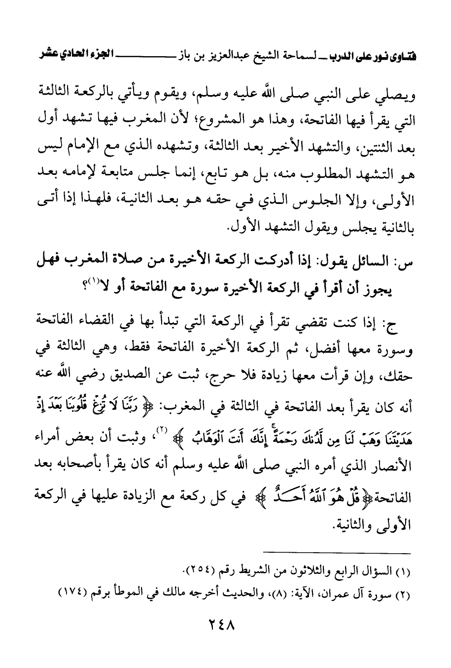 ج: إذا كنت تقضي تقرأ في الركعة التي تبدأ بها في القضاء الفاتحة وسورة معها أفضل، ثم الركعة الأخيرة الفاتحة فقط، وهي الثالثة في حقك، وإن قرأت معها زيادة فلا حرج، ثبت عن الصديق رضي الله عنه أنه كان يقرأ بعد الفاتحة في الثالثة في المغرب: {رَبَّنَا لَا تُزِغْ قُلُوبَنَا بَعْدَ إِذْ هَدَيْتَنَا وَهَبْ لَنَا مِنْ لَدُنْكَ رَحْمَةً إِنَّكَ أَنْتَ الْوَهَّابُ} (¬2) (¬3) وثبت أن بعض أمراء الأنصار الذي أمره النبي صلى الله عليه وسلم أنه كان يقرأ بأصحابه بعد الفاتحة {قُلْ هُوَ اللَّهُ أَحَدٌ} (¬4) الله في كل ركعة مع الزيادة عليها في الركعة الأولى والثانية.