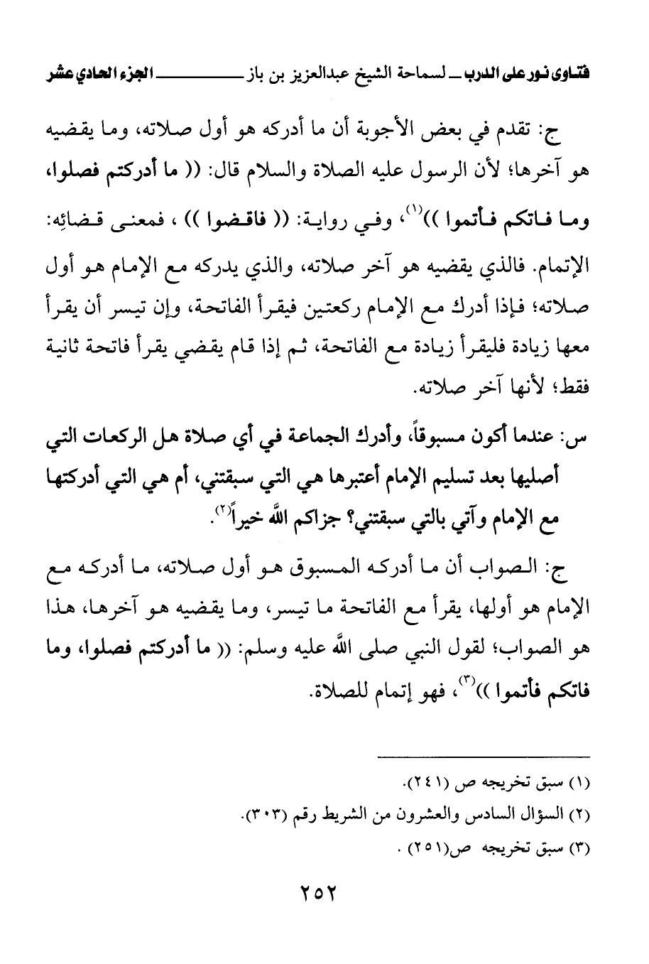 ج: الصواب أن ما أدركه المسبوق هو أول صلاته، ما أدركه مع الإمام هو أولها، يقرأ مع الفاتحة ما تيسر، وما يقضيه هو آخرها، هذا هو الصواب؛ لقول النبي صلى الله عليه وسلم: «ما أدركتم فصلوا، وما فاتكم فأتموا (¬2)» فهو إتمام للصلاة.