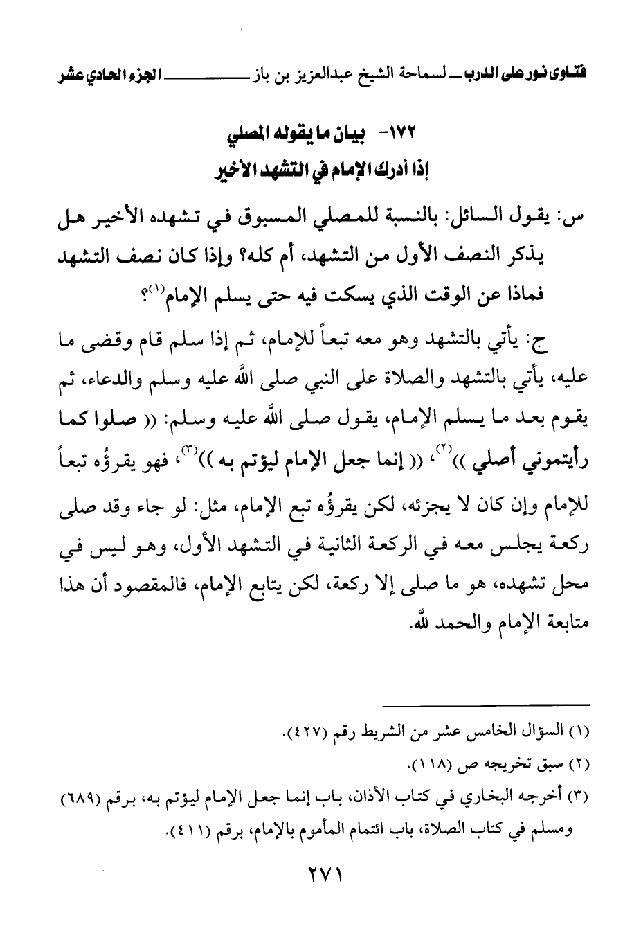 ج: يأتي بالتشهد وهو معه تبعا للإمام، ثم إذا سلم قام وقضى ما عليه، يأتي بالتشهد والصلاة على النبي صلى الله عليه وسلم والدعاء، ثم يقوم بعد ما يسلم الإمام، يقول صلى الله عليه وسلم: «صلوا كما رأيتموني أصلي (¬2)» «إنما جعل الإمام ليؤتم به (¬3)» فهو يقرؤه تبعا للإمام وإن كان لا يجزئه، لكن يقرؤه تبع الإمام، مثل: لو جاء وقد صلى ركعة يجلس معه في الركعة الثانية في التشهد الأول، وهو ليس في محل تشهده، هو ما صلى إلا ركعة، لكن يتابع الإمام، فالمقصود أن هذا متابعة الإمام والحمد لله.