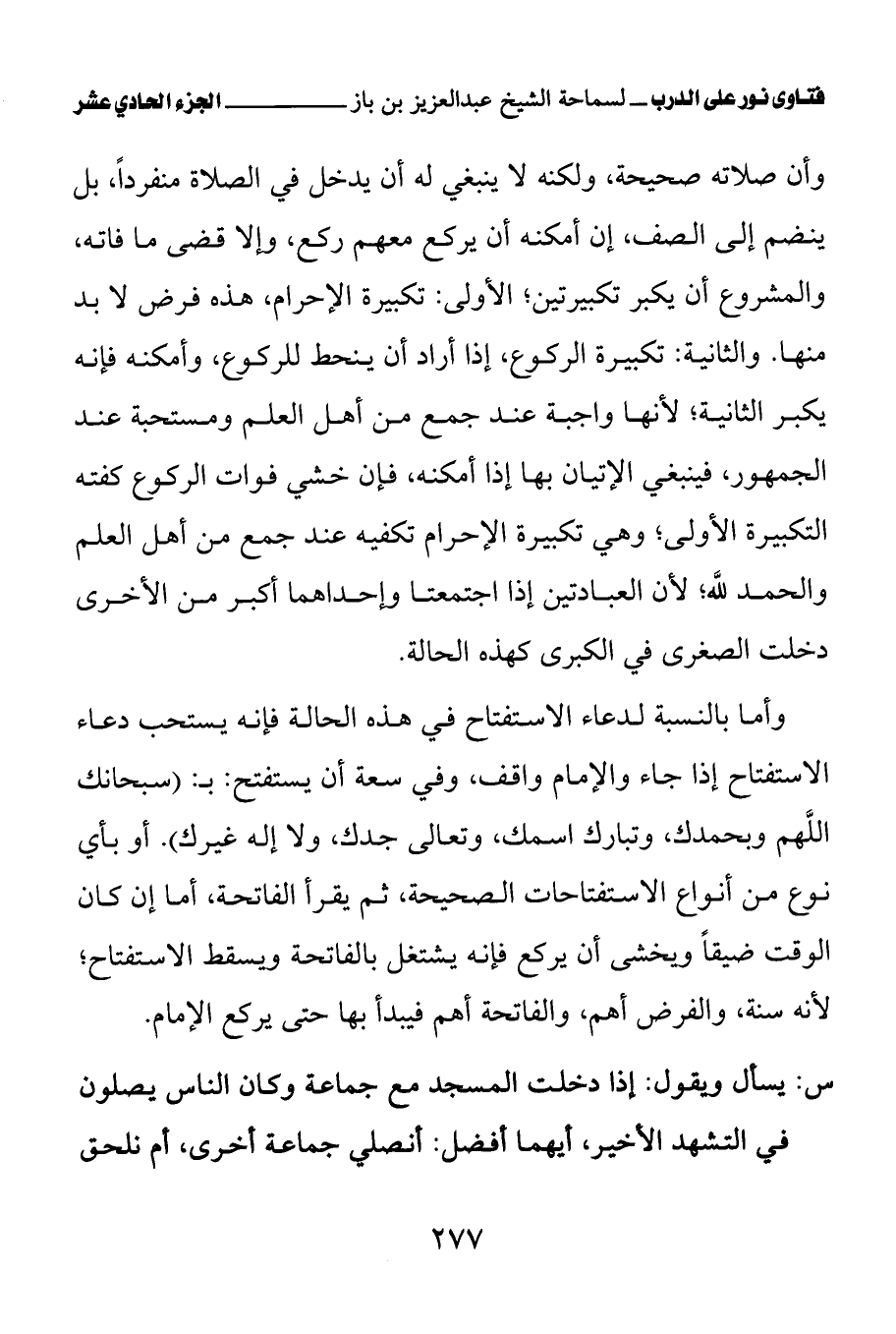 وأن صلاته صحيحة، ولكنه لا ينبغي له أن يدخل في الصلاة منفردا، بل ينضم إلى الصف، إن أمكنه أن يركع معهم ركع، وإلا قضى ما فاته، والمشروع أن يكبر تكبيرتين؛ الأولى: تكبيرة الإحرام، هذه فرض لا بد منها، والثانية: تكبيرة الركوع، إذا أراد أن ينحط للركوع، وأمكنه فإنه يكبر الثانية؛ لأنها واجبة عند جمع من أهل العلم ومستحبة عند الجمهور، فينبغي الإتيان بها إذا أمكنه، فإن خشي فوات الركوع كفته التكبيرة الأولى؛ وهي تكبيرة الإحرام تكفيه عند جمع من أهل العلم والحمد لله؛ لأن العبادتين إذا اجتمعتا وإحداهما أكبر من الأخرى دخلت الصغرى في الكبرى، كهذه الحالة.
