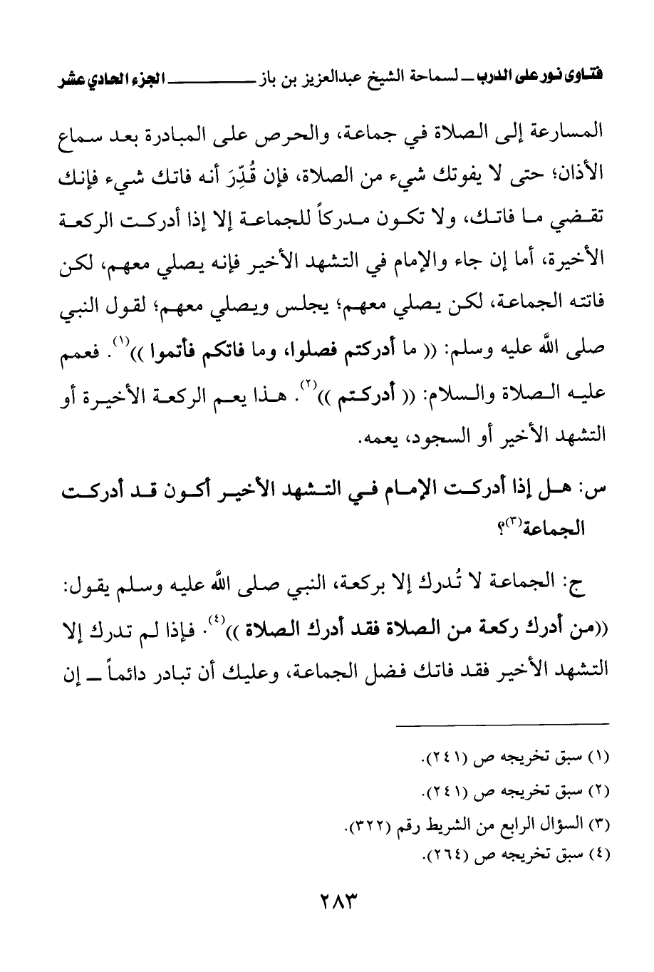 ج: الجماعة لا تدرك إلا بركعة، النبي صلى الله عليه وسلم يقول: «من أدرك ركعة من الصلاة فقد أدرك الصلاة (¬2)» فإذا لم تدرك إلا التشهد الأخير فقد فاتك فضل الجماعة، وعليك أن تبادر دائما - إن