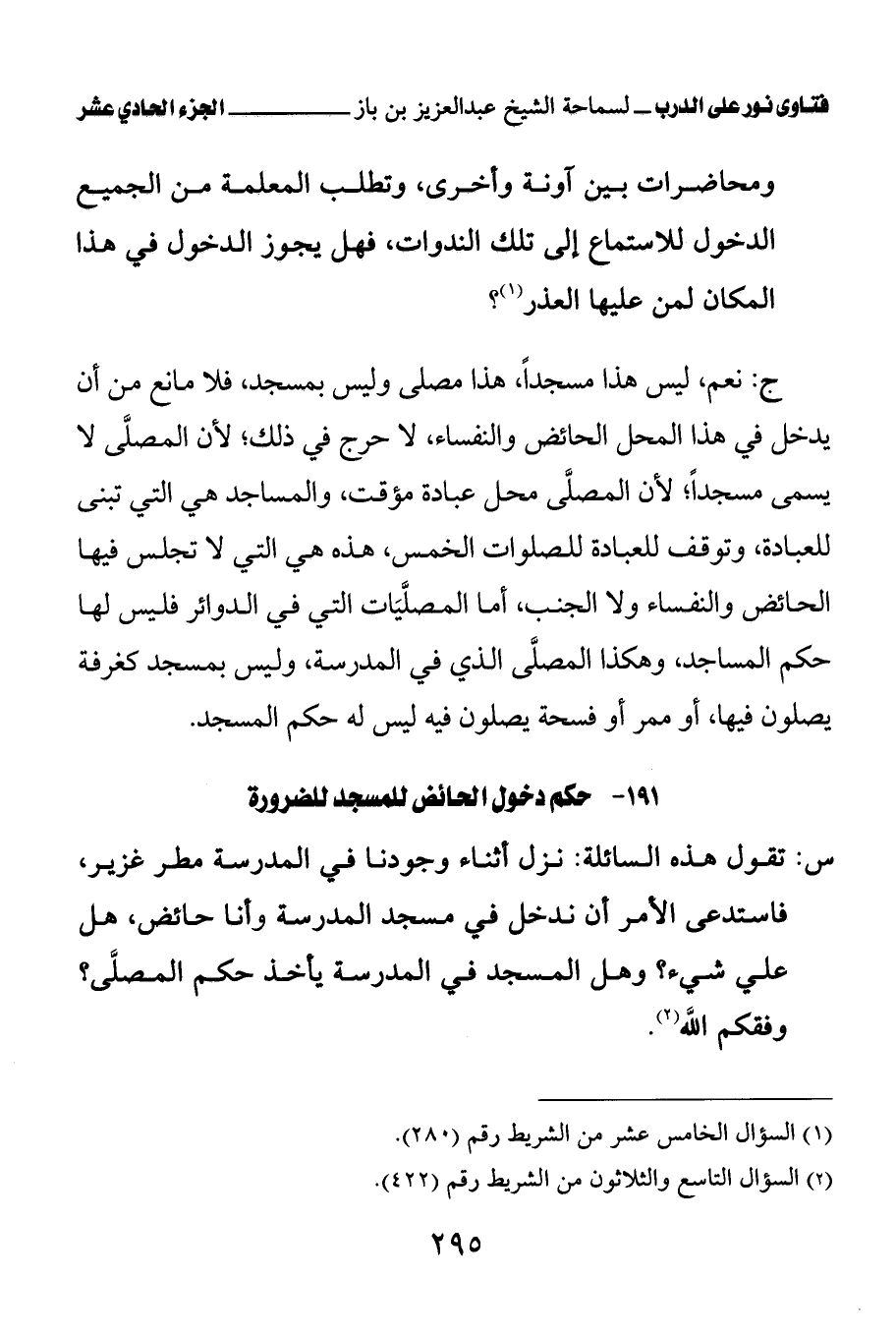 ج: نعم، ليس هذا مسجدا، هذا مصلى وليس بمسجد، فلا مانع من أن يدخل في هذا المحل الحائض والنفساء، لا حرج في ذلك؛ لأن المصلى لا يسمى مسجدا؛ لأن المصلى محل عبادة مؤقت، والمساجد هي التي تبنى للعبادة، وتوقف للعبادة للصلوات الخمس، هذه هي التي لا تجلس فيها الحائض والنفساء ولا الجنب، أما المصليات التي في الدوائر فليس لها حكم المساجد، وهكذا المصلى الذي في المدرسة، وليس بمسجد كغرفة يصلون فيها، أو ممر أو فسحة يصلون فيه ليس له حكم المسجد.