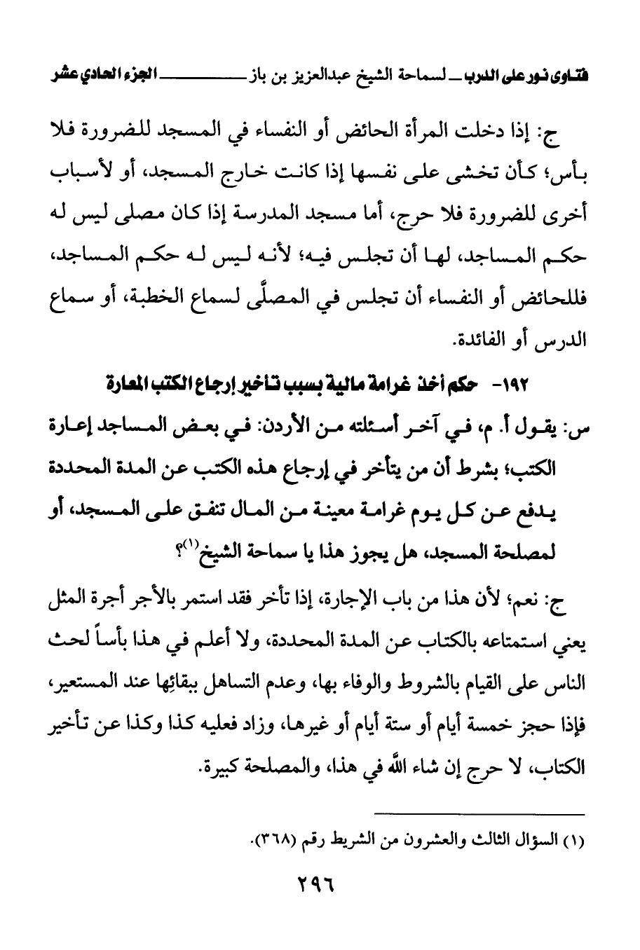 س: يقول أ. م، في آخر أسئلته من الأردن: في بعض المساجد إعارة الكتب؛ بشرط أن من يتأخر في إرجاع هذه الكتب عن المدة المحددة يدفع عن كل يوم غرامة معينة من المال تنفق على المسجد، أو لمصلحة المسجد، هل يجوز هذا يا سماحة الشيخ (¬1)؟