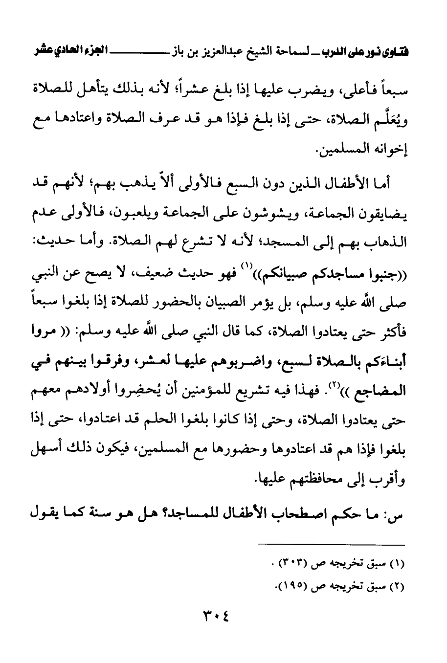 أما الأطفال الذين دون السبع فالأولى ألا يذهب بهم؛ لأنهم قد يضايقون الجماعة، ويشوشون على الجماعة ويلعبون، فالأولى عدم الذهاب بهم إلى المسجد؛ لأنه لا تشرع لهم الصلاة. وأما حديث: «جنبوا مساجدكم صبيانكم (¬1)» فهو حديث ضعيف، لا يصح عن النبي صلى الله عليه وسلم، بل يؤمر الصبيان بالحضور للصلاة إذا بلغوا سبعا فأكثر حتى يعتادوا الصلاة، كما قال النبي صلى الله عليه وسلم: «مروا أبناءكم بالصلاة لسبع، واضربوهم عليها لعشر، وفرقوا بينهم في المضاجع (¬2)» فهذا فيه تشريع للمؤمنين أن يحضروا أولادهم معهم حتى يعتادوا الصلاة، وحتى إذا كانوا بلغوا الحلم قد اعتادوا، حتى إذا بلغوا فإذا هم قد اعتادوها وحضورها مع المسلمين، فيكون ذلك أسهل وأقرب إلى محافظتهم عليها.