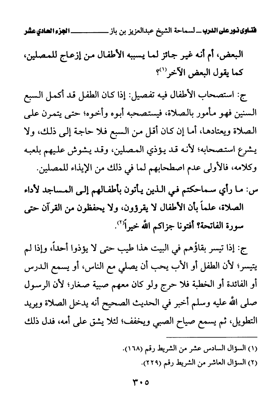 س: ما رأي سماحكتم في الذين يأتون بأطفالهم إلى المساجد لأداء الصلاة، علما بأن الأطفال لا يقرؤون، ولا يحفظون من القرآن حتى سورة الفاتحة؟ أفتونا جزاكم الله خيرا (¬1)؟