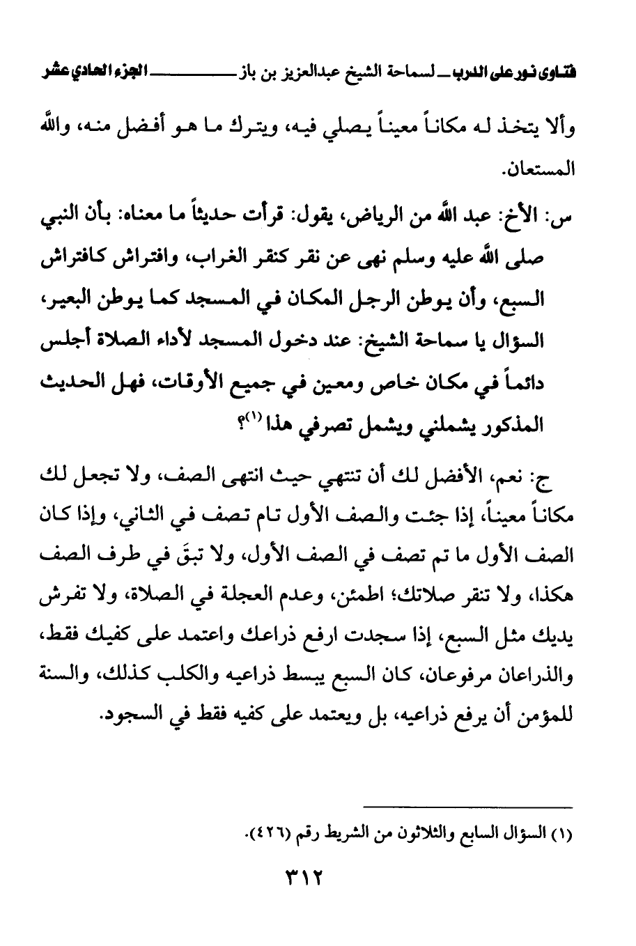 س: الأخ: عبد الله من الرياض، يقول: قرأت حديثا ما معناه: بأن النبي صلى الله عليه وسلم نهى عن نقر كنقر الغراب، وافتراش كافتراش السبع، وأن يوطن الرجل المكان في المسجد كما يوطن البعير، السؤال يا سماحة الشيخ: عند دخول المسجد لأداء الصلاة أجلس دائما في مكان خاص ومعين في جميع الأوقات، فهل الحديث المذكور يشملني ويشمل تصرفي هذا (¬1)؟