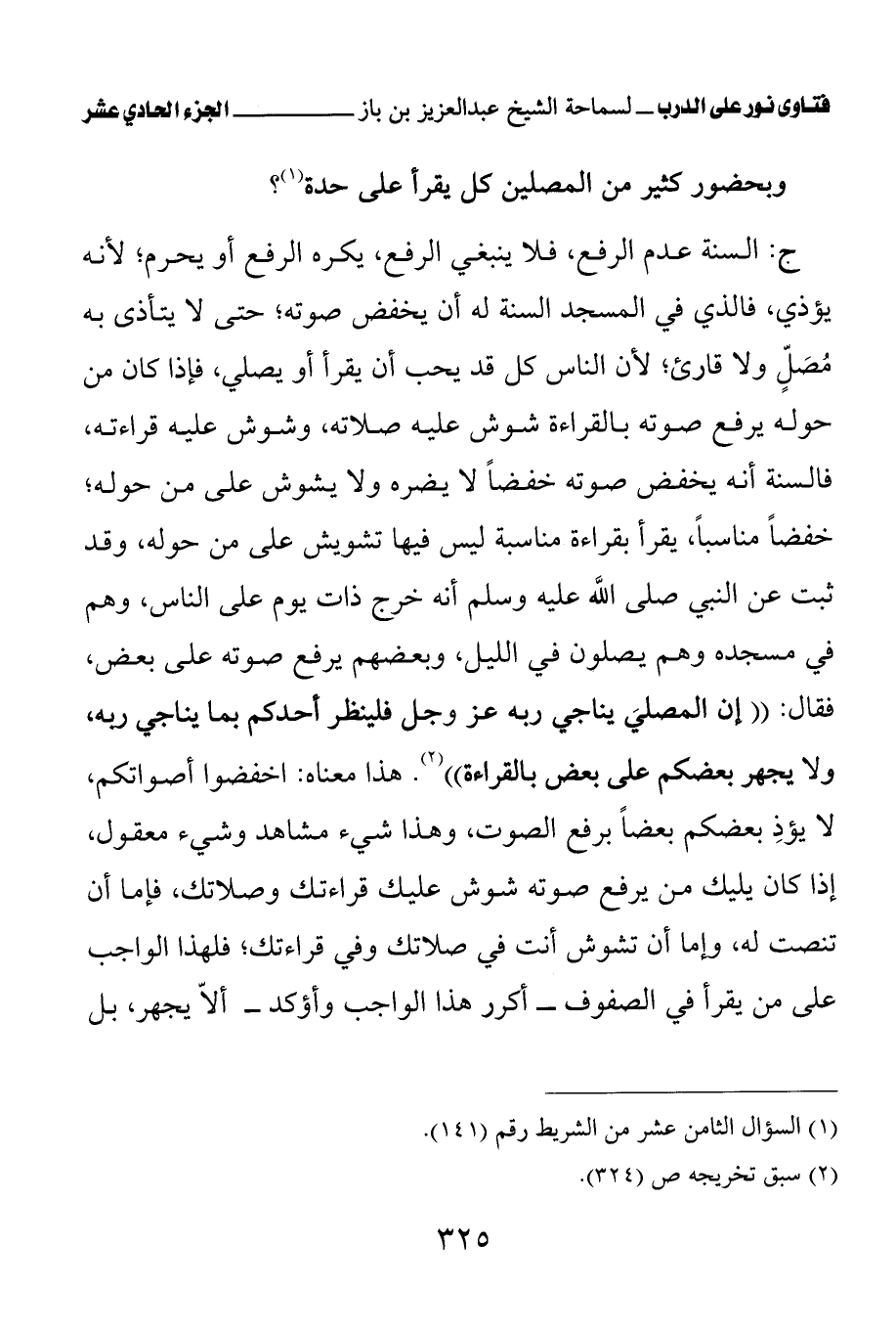 ج: السنة عدم الرفع، فلا ينبغي الرفع، يكره الرفع أو يحرم؛ لأنه يؤذي، فالذي في المسجد السنة له أن يخفض صوته؛ حتى لا يتأذى به مصل ولا قارئ؛ لأن الناس كل قد يحب أن يقرأ أو يصلي، فإذا كان من حوله يرفع صوته بالقراءة شوش عليه صلاته، وشوش عليه قراءته، فالسنة أنه يخفض صوته خفضا لا يضره ولا يشوش على من حوله؛ خفضا مناسبا، يقرأ بقراءة مناسبة ليس فيها تشويش على من حوله، وقد ثبت عن النبي صلى الله عليه وسلم أنه خرج ذات يوم على الناس، وهم في مسجده وهم يصلون في الليل، وبعضهم يرفع صوته على بعض، فقال: «إن المصلي يناجي ربه عز وجل فلينظر أحدكم بما يناجي ربه، ولا يجهر بعضكم على بعض بالقراءة (¬2)» هذا معناه: اخفضوا أصواتكم، لا يؤذ بعضكم بعضا برفع الصوت، وهذا شيء مشاهد وشيء معقول، إذا كان يليك من يرفع صوته شوش عليك قراءتك وصلاتك، فإما أن تنصت له، وإما أن تشوش أنت في صلاتك وفي قراءتك؛ فلهذا الواجب على من يقرأ في الصفوف - أكرر هذا الواجب وأؤكد - ألا يجهر، بل