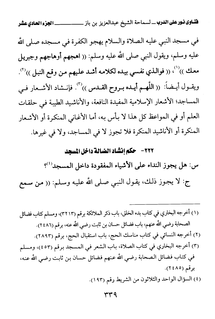 في مسجد النبي عليه الصلاة والسلام يهجو الكفرة في مسجده صلى الله عليه وسلم، ويقول النبي صلى الله عليه وسلم: «اهجهم أو هاجهم وجبريل معك (¬1)» «فوالذي نفسي بيده لكلامه أشد عليهم من وقع النبل (¬2)» ويقول أيضا: «اللهم أيده بروح القدس (¬3)» فإنشاد الأشعار في المساجد؛ الأشعار الإسلامية المفيدة النافعة، والأناشيد الطيبة في حلقات العلم أو في المواعظ، كل هذا لا بأس به، أما الأغاني المنكرة، أو الأشعار المنكرة، أو الأناشيد المنكرة فلا تجوز لا في المساجد، ولا في غيرها.