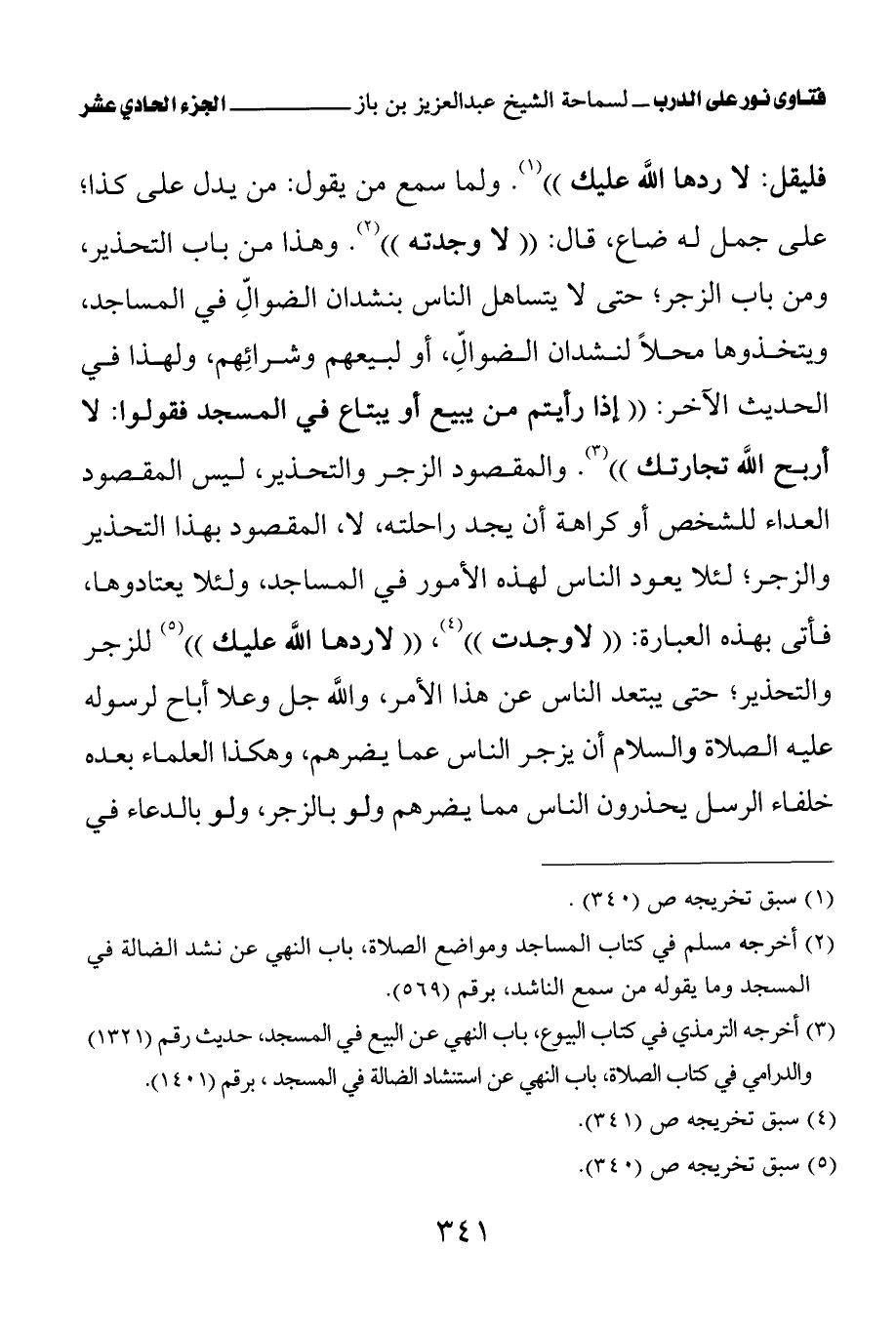 فليقل: لا ردها الله عليك (¬1)» ولما سمع من يقول: من يدل على كذا؛ على جمل له ضاع، قال: «لا وجدته (¬2)» وهذا من باب التحذير، ومن باب الزجر؛ حتى لا يتساهل الناس بنشدان الضوال في المساجد، ويتخذوها محلا لنشدان الضوال، أو لبيعهم وشرائهم، ولهذا في الحديث الآخر: «إذا رأيتم من يبيع أو يبتاع في المسجد فقولوا: لا أربح الله تجارتك (¬3)» والمقصود الزجر والتحذير، ليس المقصود العداء للشخص أو كراهة أن يجد راحلته، لا، المقصود بهذا التحذير والزجر؛ لئلا يعود الناس لهذه الأمور في المساجد، ولئلا يعتادوها، فأتى بهذه العبارة: «لا وجدت (¬4)» «لا ردها الله عليك (¬5)» للزجر والتحذير؛ حتى يبتعد الناس عن هذا الأمر، والله جل وعلا أباح لرسوله عليه الصلاة والسلام أن يزجر الناس عما يضرهم، وهكذا العلماء بعده خلفاء الرسل يحذرون الناس مما يضرهم ولو بالزجر، ولو بالدعاء في