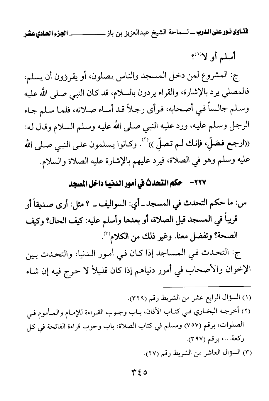 ج: المشروع لمن دخل المسجد والناس يصلون، أو يقرؤون أن يسلم، فالمصلي يرد بالإشارة، والقراء يردون بالسلام، قد كان النبي صلى الله عليه وسلم جالسا في أصحابه، فرأى رجلا قد أساء صلاته، فلما سلم جاء الرجل وسلم عليه، ورد عليه النبي صلى الله عليه وسلم السلام وقال له: «ارجع فصل، فإنك لم تصل (¬2)» وكانوا يسلمون على النبي صلى الله عليه وسلم وهو في الصلاة، فيرد عليهم بالإشارة عليه الصلاة والسلام.