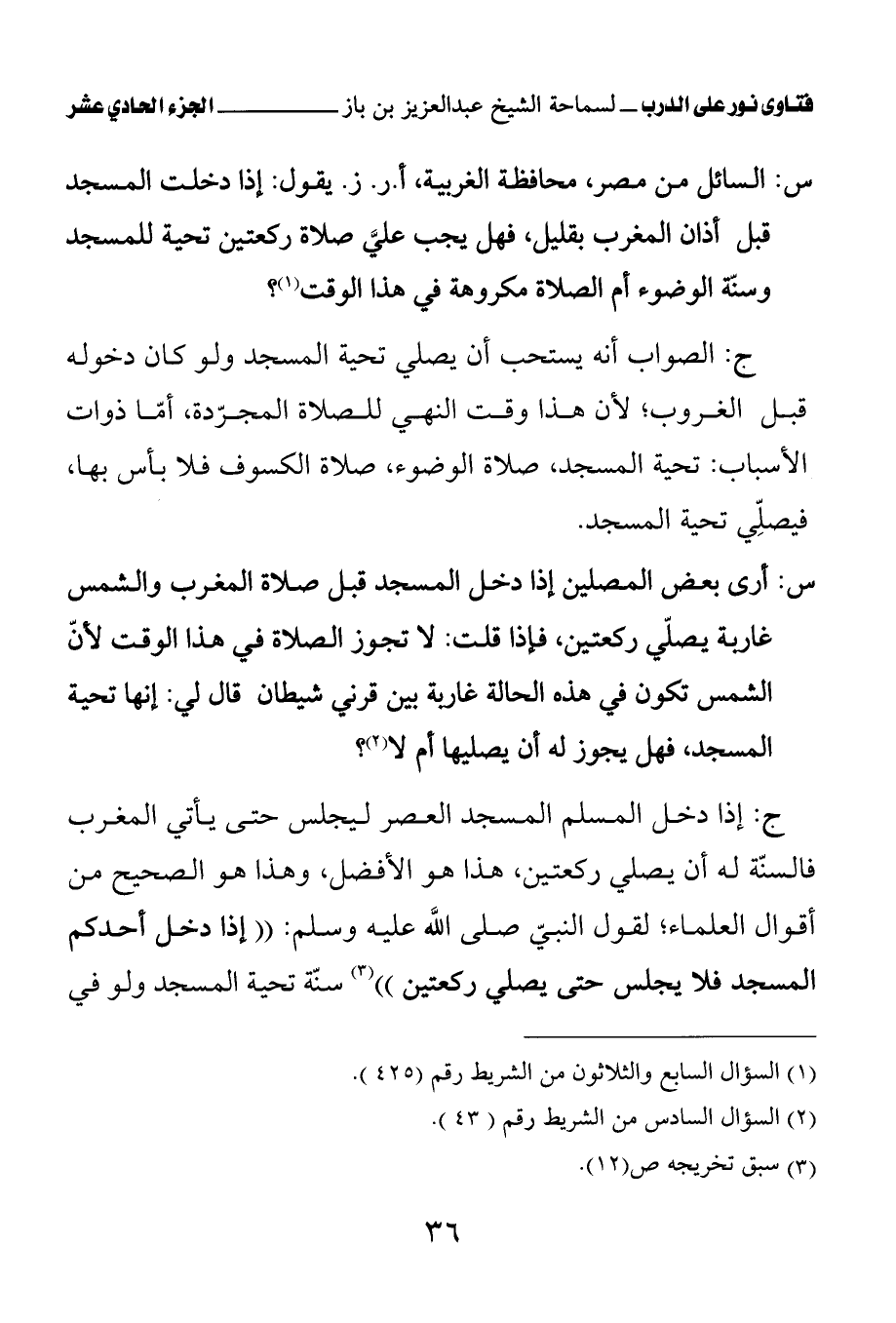 س: السائل من مصر، محافظة الغربية، أ. ر. ز. يقول: إذا دخلت المسجد قبل أذان المغرب بقليل، فهل يجب علي صلاة ركعتين تحية للمسجد وسنة الوضوء أم الصلاة مكروهة في هذا الوقت (¬1)