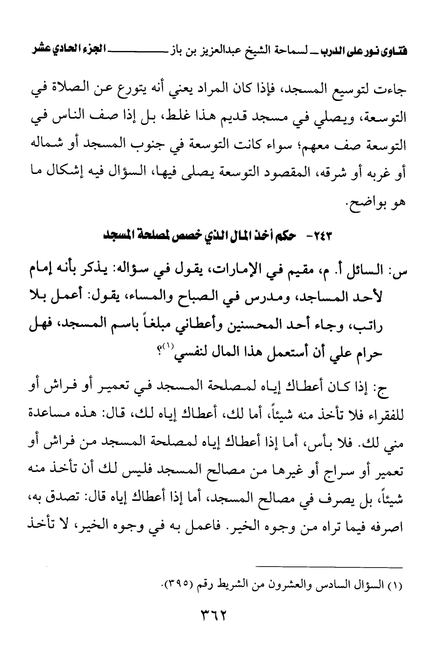 243 - حكم أخذ المال الذي خصص لمصلحة المسجد