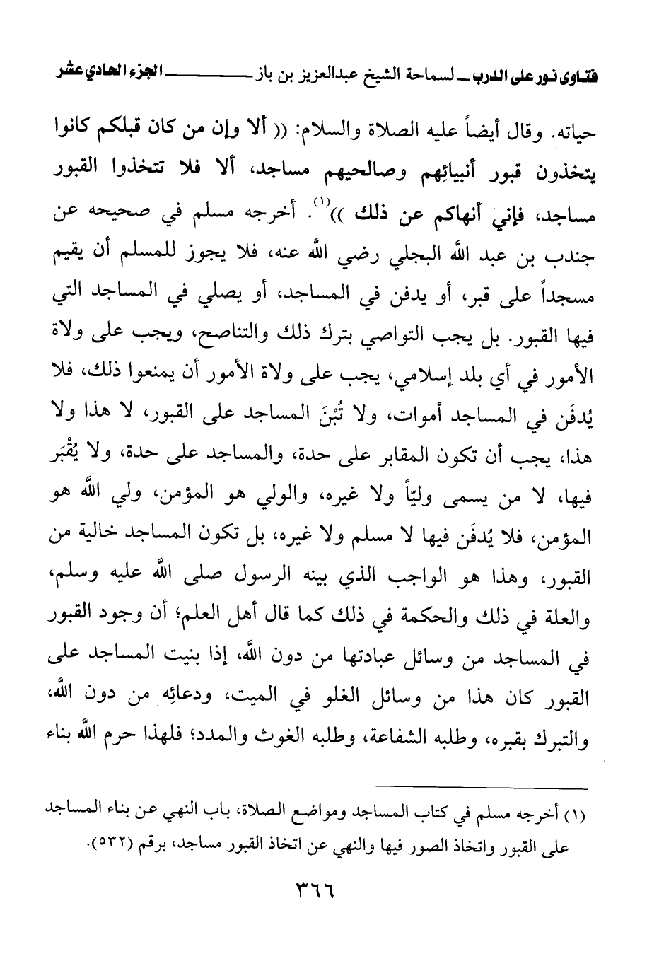 حياته. وقال أيضا عليه الصلاة والسلام: «ألا وإن من كان قبلكم كانوا يتخذون قبور أنبيائهم وصالحيهم مساجد، ألا فلا تتخذوا القبور مساجد، فإني أنهاكم عن ذلك (¬1)» أخرجه مسلم في صحيحه عن جندب بن عبد الله البجلي رضي الله عنه، فلا يجوز للمسلم أن يقيم مسجدا على قبر، أو يدفن في المساجد، أو يصلي في المساجد التي فيها القبور. بل يجب التواصي بترك ذلك والتناصح، ويجب على ولاة الأمور في أي بلد إسلامي، يجب على ولاة الأمور أن يمنعوا ذلك، فلا يدفن في المساجد أموات، ولا تبن المساجد على القبور، لا هذا ولا هذا، يجب أن تكون المقابر على حدة، والمساجد على حدة، ولا يقبر فيها، لا من يسمى وليا ولا غيره، والولي هو المؤمن، ولي الله هو المؤمن، فلا يدفن فيها لا مسلم ولا غيره، بل تكون المساجد خالية من القبور، وهذا هو الواجب الذي بينه الرسول صلى الله عليه وسلم، والعلة في ذلك والحكمة في ذلك كما قال أهل العلم؛ أن وجود القبور في المساجد من وسائل عبادتها من دون الله، إذا بنيت المساجد على القبور كان هذا من وسائل الغلو في الميت، ودعائه من دون الله، والتبرك بقبره، وطلبه الشفاعة، وطلبه الغوث والمدد؛ فلهذا حرم الله بناء