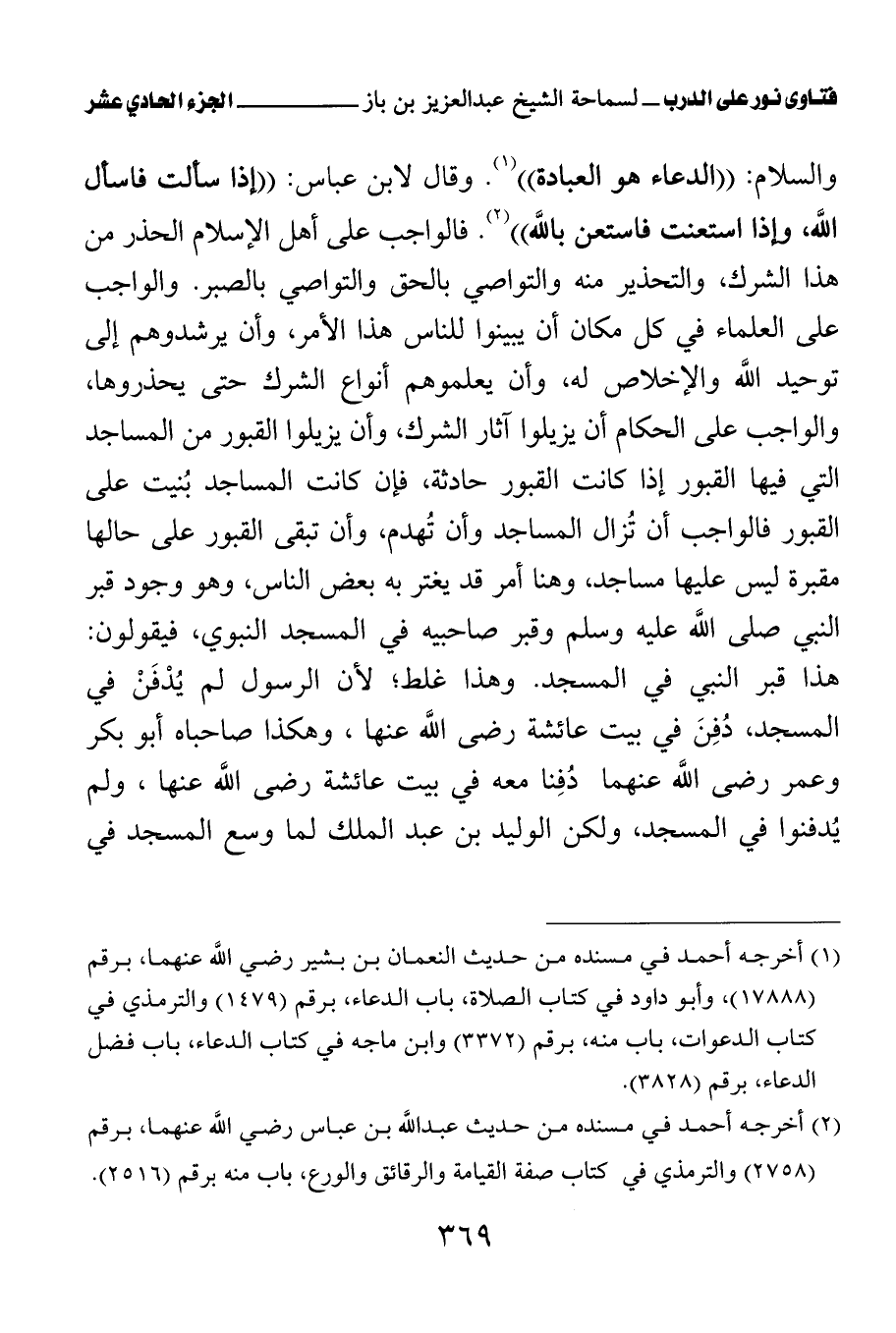 والسلام: «الدعاء هو العبادة (¬1)» وقال لابن عباس: «إذا سألت فاسأل الله، وإذا استعنت فاستعن بالله (¬2)» فالواجب على أهل الإسلام الحذر من هذا الشرك، والتحذير منه والتواصي بالحق والتواصي بالصبر. والواجب على العلماء في كل مكان أن يبينوا للناس هذا الأمر، وأن يرشدوهم إلى توحيد الله والإخلاص له، وأن يعلموهم أنواع الشرك حتى يحذروها، والواجب على الحكام أن يزيلوا آثار الشرك، وأن يزيلوا القبور من المساجد التي فيها القبور إذا كانت القبور حادثة، فإن كانت المساجد بنيت على القبور فالواجب أن تزال المساجد وأن تهدم، وأن تبقى القبور على حالها مقبرة ليس عليها مساجد، وهنا أمر قد يغتر به بعض الناس، وهو وجود قبر النبي صلى الله عليه وسلم وقبر صاحبيه في المسجد النبوي، فيقولون: هذا قبر النبي في المسجد. وهذا غلط؛ لأن الرسول لم يدفن في المسجد، دفن في بيت عائشة رضي الله عنها، وهكذا صاحباه أبو بكر وعمر رضي الله عنهما دفنا معه في بيت عائشة رضي الله عنها، ولم يدفنوا في المسجد، ولكن الوليد بن عبد الملك لما وسع المسجد في