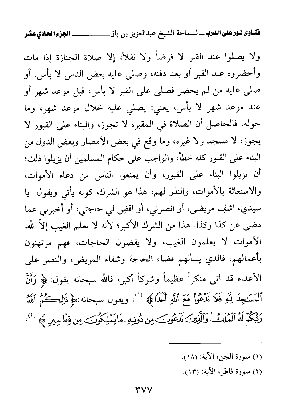 ولا يصلوا عند القبر لا فرضا ولا نفلا، إلا صلاة الجنازة إذا مات وأحضروه عند القبر أو بعد دفنه، وصلى عليه بعض الناس لا بأس، أو صلى عليه من لم يحضر فصلى على القبر لا بأس، قبل موعد شهر أو عند موعد شهر لا بأس، يعني: يصلي عليه خلال موعد شهر، وما حوله، فالحاصل أن الصلاة في المقبرة لا تجوز، والبناء على القبور لا يجوز، لا مسجد ولا غيره، وما وقع في بعض الأمصار وبعض الدول من البناء على القبور كله خطأ، والواجب على حكام المسلمين أن يزيلوا ذلك؛ أن يزيلوا البناء على القبور، وأن يمنعوا الناس من دعاء الأموات، والاستغاثة بالأموات، والنذر لهم، هذا هو الشرك، كونه يأتي ويقول: يا سيدي، اشف مريضي، أو انصرني، أو اقض لي حاجتي، أو أخبرني عما مضى عن كذا وكذا. هذا من الشرك الأكبر؛ لأنه لا يعلم الغيب إلا الله، الأموات لا يعلمون الغيب، ولا يقضون الحاجات، فهم مرتهنون بأعمالهم، فالذي يسألهم قضاء الحاجة وشفاء المريض، والنصر على الأعداء قد أتى منكرا عظيما وشركا أكبر، فالله سبحانه يقول: {وَأَنَّ الْمَسَاجِدَ لِلَّهِ فَلَا تَدْعُوا مَعَ اللَّهِ أَحَدًا} (¬1)، ويقول سبحانه: {ذَلِكُمُ اللَّهُ رَبُّكُمْ لَهُ الْمُلْكُ وَالَّذِينَ تَدْعُونَ مِنْ دُونِهِ مَا يَمْلِكُونَ مِنْ قِطْمِيرٍ} (¬2)،