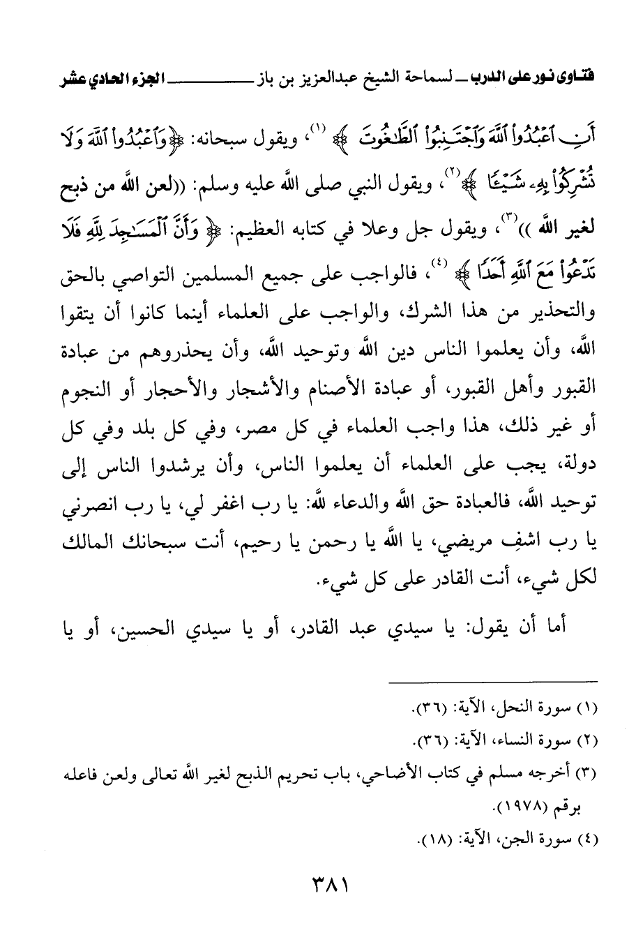 ويقول سبحانه: {وَاعْبُدُوا اللَّهَ وَلَا تُشْرِكُوا بِهِ شَيْئًا} (¬1)، ويقول النبي صلى الله عليه وسلم: «لعن الله من ذبح لغير الله (¬2)» ويقول جل وعلا في كتابه العظيم: {وَأَنَّ الْمَسَاجِدَ لِلَّهِ فَلَا تَدْعُوا مَعَ اللَّهِ أَحَدًا} (¬3)، فالواجب على جميع المسلمين التواصي بالحق والتحذير من هذا الشرك، والواجب على العلماء أينما كانوا أن يتقوا الله، وأن يعلموا الناس دين الله وتوحيد الله، وأن يحذروهم من عبادة القبور وأهل القبور، أو عبادة الأصنام والأشجار والأحجار أو النجوم أو غير ذلك، هذا واجب العلماء في كل مصر، وفي كل بلد وفي كل دولة، يجب على العلماء أن يعلموا الناس، وأن يرشدوا الناس إلى توحيد الله، فالعبادة حق الله والدعاء لله: يا رب اغفر لي، يا رب انصرني يا رب اشف مريضي، يا الله يا رحمن يا رحيم، أنت سبحانك المالك لكل شيء، أنت القادر على كل شيء.