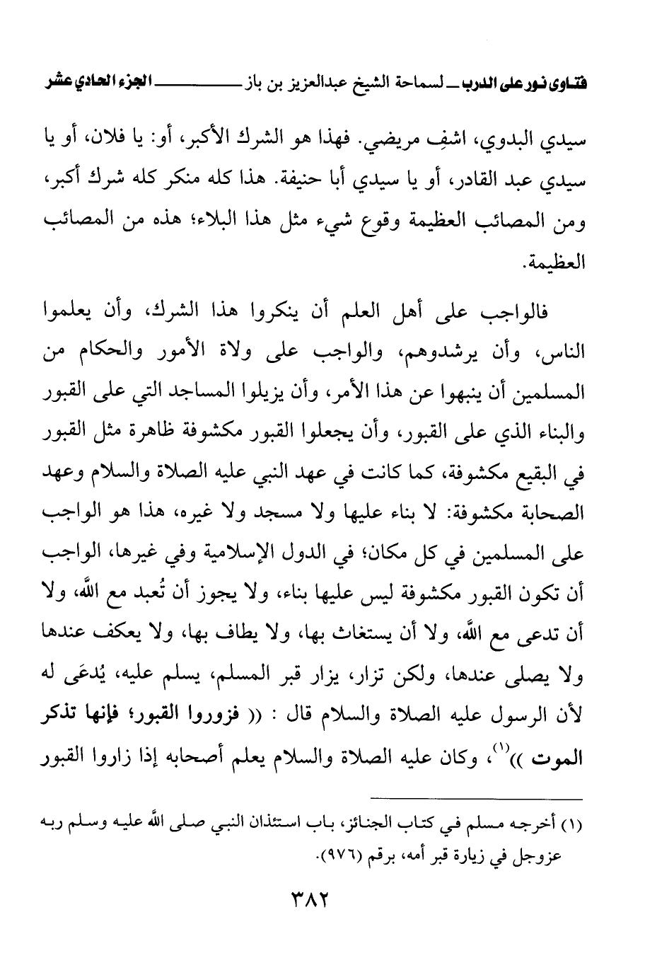 فالواجب على أهل العلم أن ينكروا هذا الشرك، وأن يعلموا الناس، وأن يرشدوهم، والواجب على ولاة الأمور والحكام من المسلمين أن ينبهوا عن هذا الأمر، وأن يزيلوا المساجد التي على القبور والبناء الذي على القبور، وأن يجعلوا القبور مكشوفة ظاهرة مثل القبور في البقيع مكشوفة، كما كانت في عهد النبي عليه الصلاة والسلام وعهد الصحابة مكشوفة: لا بناء عليها ولا مسجد ولا غيره، هذا هو الواجب على المسلمين في كل مكان؛ في الدول الإسلامية وفي غيرها، الواجب أن تكون القبور مكشوفة ليس عليها بناء، ولا يجوز أن تعبد مع الله، ولا أن تدعى مع الله، ولا أن يستغاث بها، ولا يطاف بها، ولا يعكف عندها ولا يصلى عندها، ولكن تزار، يزار قبر المسلم، يسلم عليه، يدعى له لأن الرسول عليه الصلاة والسلام قال: «فزوروا القبور؛ فإنها تذكر الموت (¬1)» وكان عليه الصلاة والسلام يعلم أصحابه إذا زاروا القبور