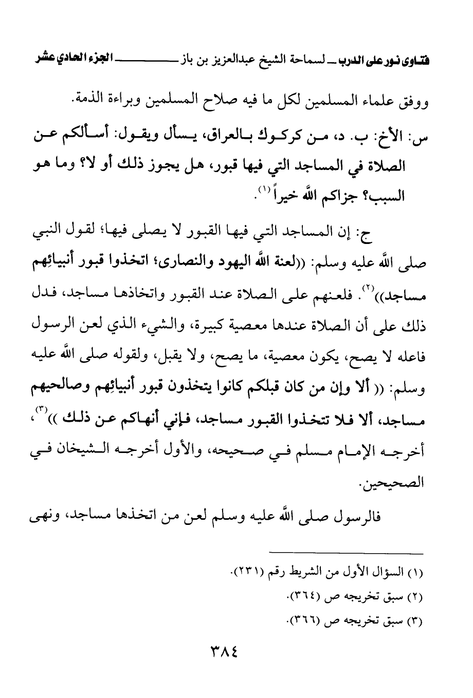 ج: إن المساجد التي فيها القبور لا يصلى فيها؛ لقول النبي صلى الله عليه وسلم: «لعنة الله على اليهود والنصارى؛ اتخذوا قبور أنبيائهم مساجد (¬2)» فلعنهم على الصلاة عند القبور واتخاذها مساجد، فدل ذلك على أن الصلاة عندها معصية كبيرة، والشيء الذي لعن الرسول فاعله لا يصح، يكون معصية، ما يصح، ولا يقبل، ولقوله صلى الله عليه وسلم: «ألا وإن من كان قبلكم كانوا يتخذون قبور أنبيائهم وصالحيهم مساجد، ألا فلا تتخذوا القبور مساجد، فإني أنهاكم عن ذلك (¬3)» أخرجه الإمام مسلم في صحيحه، والأول أخرجه الشيخان في الصحيحين.