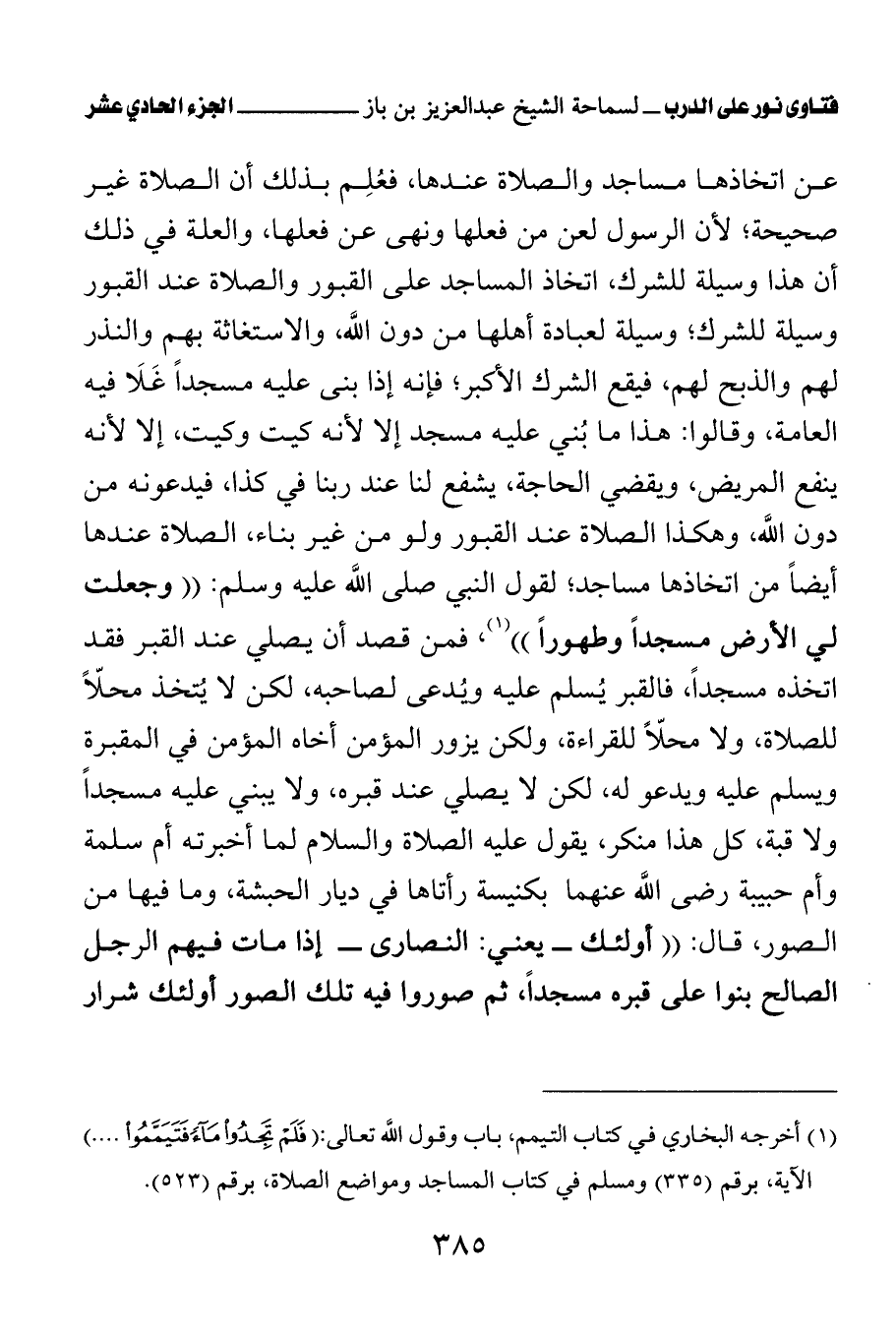 عن اتخاذها مساجد والصلاة عندها، فعلم بذلك أن الصلاة غير صحيحة؛ لأن الرسول لعن من فعلها ونهى عن فعلها، والعلة في ذلك أن هذا وسيلة للشرك، اتخاذ المساجد على القبور والصلاة عند القبور وسيلة للشرك؛ وسيلة لعبادة أهلها من دون الله، والاستغاثة بهم والنذر لهم والذبح لهم، فيقع الشرك الأكبر؛ فإنه إذا بنى عليه مسجدا غلا فيه العامة، وقالوا: هذا ما بني عليه مسجد إلا لأنه كيت وكيت، إلا لأنه ينفع المريض، ويقضي الحاجة، يشفع لنا عند ربنا في كذا، فيدعونه من دون الله، وهكذا الصلاة عند القبور ولو من غير بناء، الصلاة عندها أيضا من اتخاذها مساجد؛ لقول النبي صلى الله عليه وسلم: «وجعلت لي الأرض مسجدا وطهورا (¬1)»