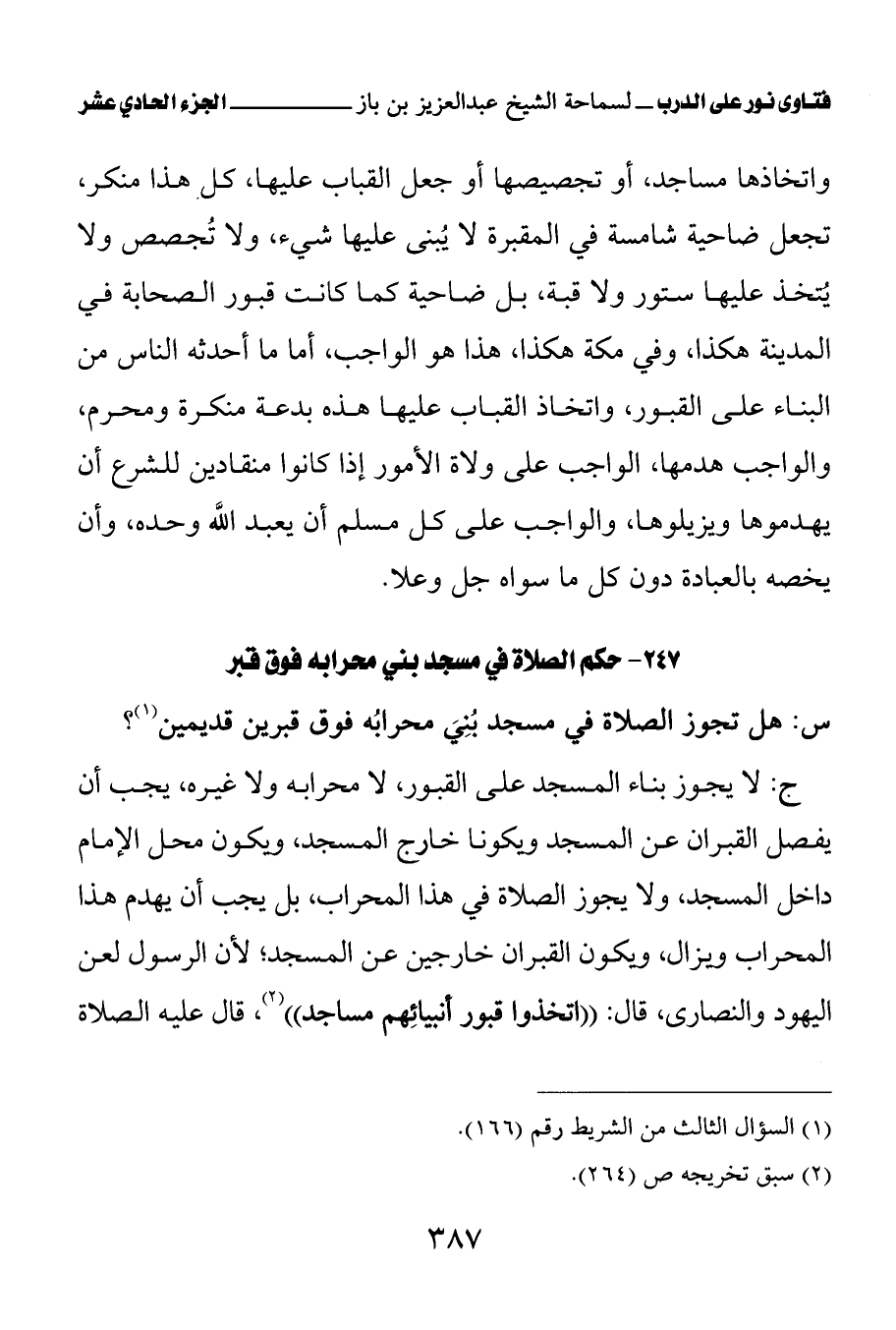 ج: لا يجوز بناء المسجد على القبور، لا محرابه ولا غيره، يجب أن يفصل القبران عن المسجد ويكونا خارج المسجد، ويكون محل الإمام داخل المسجد، ولا يجوز الصلاة في هذا المحراب، بل يجب أن يهدم هذا المحراب ويزال، ويكون القبران خارجين عن المسجد؛ لأن الرسول لعن اليهود والنصارى، قال: «اتخذوا قبور أنبيائهم مساجد (¬2)» قال عليه الصلاة