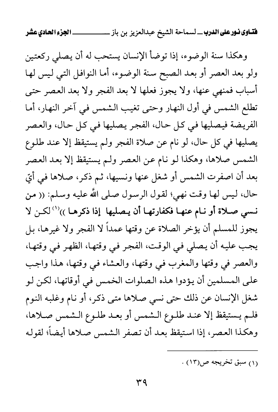 وهكذا سنة الوضوء، إذا توضأ الإنسان يستحب له أن يصلي ركعتين ولو بعد العصر أو بعد الصبح سنة الوضوء، أما النوافل التي ليس لها أسباب فمنهي عنها، ولا يجوز فعلها لا بعد الفجر ولا بعد العصر حتى تطلع الشمس في أول النهار وحتى تغيب الشمس في آخر النهار، أما الفريضة فيصليها في كل حال، الفجر يصليها في كل حال، والعصر يصليها في كل حال، لو نام عن صلاة الفجر ولم يستيقظ إلا عند طلوع الشمس صلاها، وهكذا لو نام عن العصر ولم يستيقظ إلا بعد العصر بعد أن اصفرت الشمس أو شغل عنها ونسيها، ثم ذكر، صلاها في أي حال، ليس لها وقت نهي؛ لقول الرسول صلى الله عليه وسلم: «من نسي صلاة أو نام عنها فكفارتها أن يصليها إذا ذكرها (¬1)» لكن لا يجوز للمسلم أن يؤخر الصلاة عن وقتها عمدا لا الفجر ولا غيرها، بل يجب عليه أن يصلي في الوقت، الفجر في وقتها، الظهر في وقتها، والعصر في وقتها، والمغرب في وقتها، والعشاء في وقتها، هذا واجب على المسلمين أن يؤدوا هذه الصلوات الخمس في أوقاتها، لكن لو شغل الإنسان عن ذلك حتى نسي صلاها متى ذكر، أو نام وغلبه النوم فلم يستيقظ إلا عند طلوع الشمس أو بعد طلوع الشمس صلاها، وهكذا العصر، إذا استيقظ بعد أن تصفر الشمس صلاها أيضا؛ لقوله