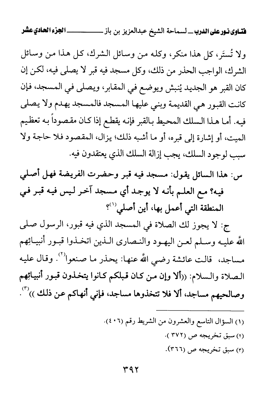 ولا تستر، كل هذا منكر، وكله من وسائل الشرك، كل هذا من وسائل الشرك، الواجب الحذر من ذلك، وكل مسجد فيه قبر لا يصلى فيه، لكن إن كان القبر هو الجديد ينبش ويوضع في المقابر، ويصلى في المسجد، فإن كانت القبور هي القديمة وبني عليها المسجد فالمسجد يهدم ولا يصلى فيه. أما هذا السلك المحيط بالقبر فإنه يقطع إذا كان مقصودا به تعظيم الميت، أو إشارة إلى قبره، أو ما أشبه ذلك؛ يزال، المقصود فلا حاجة ولا سبب لوجود السلك، يجب إزالة السلك الذي يعتقدون فيه.